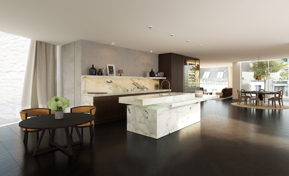 De private oppervlaktes zijn nog te ontwerpen en in te vullen volgens persoonlijke smaak. Aan de hand van moodboards geeft het bureau een inkijk in de afwerkingsmogelijkheden van bijvoorbeeld het penthouse en het derde verdiep. Zeker een aanrader om te contacteren bij interesse.
