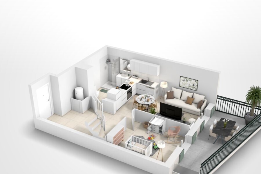 The second apartment (T3) is located on the second floor (R+2) and has two bedrooms and two bathrooms, a kitchen/living room and an office. The apartment has a surface area of 79.25m2 and costs €1,350,000.