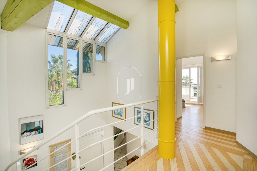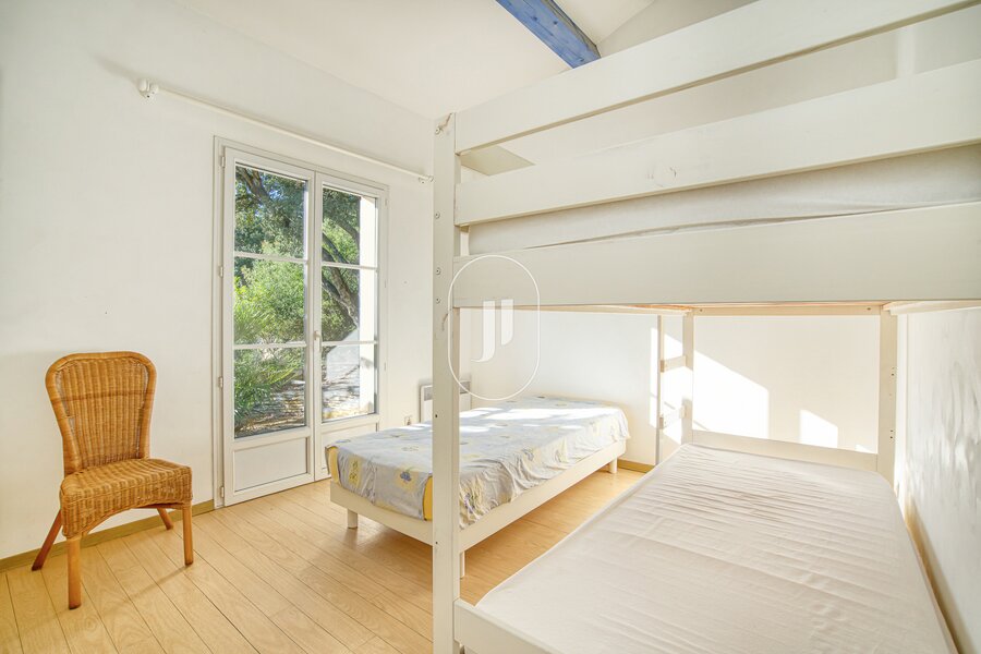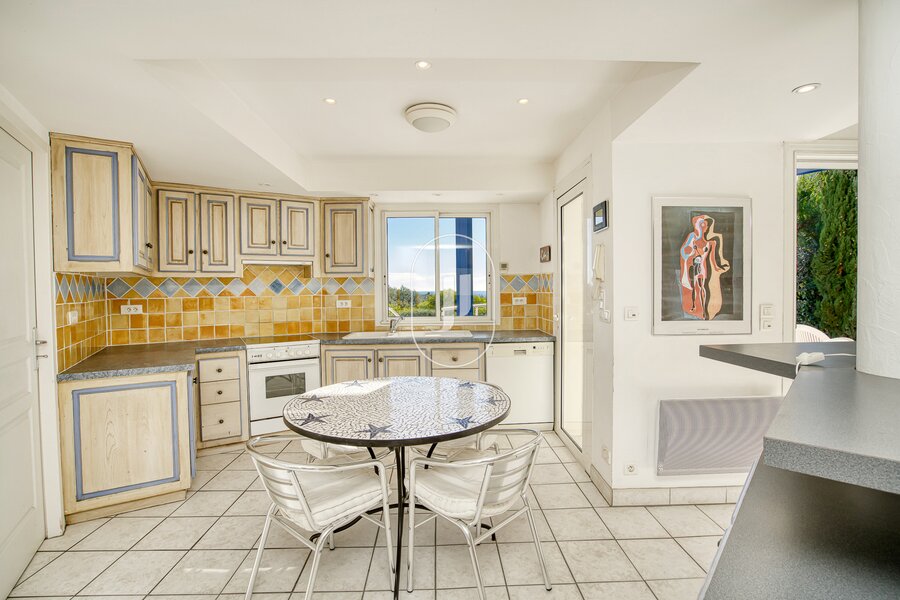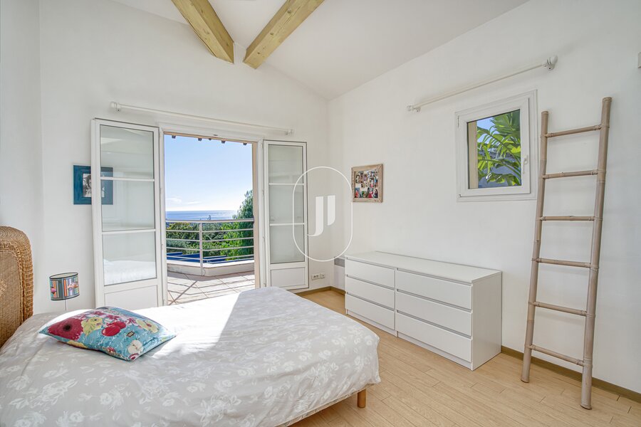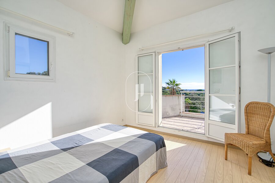 The ground floor, with its high ceilings, presents a double lounge with fireplace and a fitted kitchen opening onto the lounge, all looking out on a terrace with a commanding view of the swimming pool, perfect for dining under the stars. On the same level is a main bedroom suite with private shower room for complete privacy. Upstairs, there are four more bedrooms (two benefitting from a terrace and a superb sea view, and two with direct outdoor access).