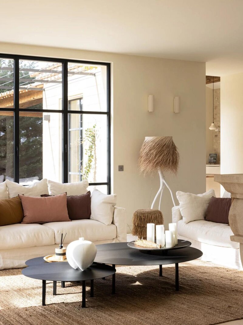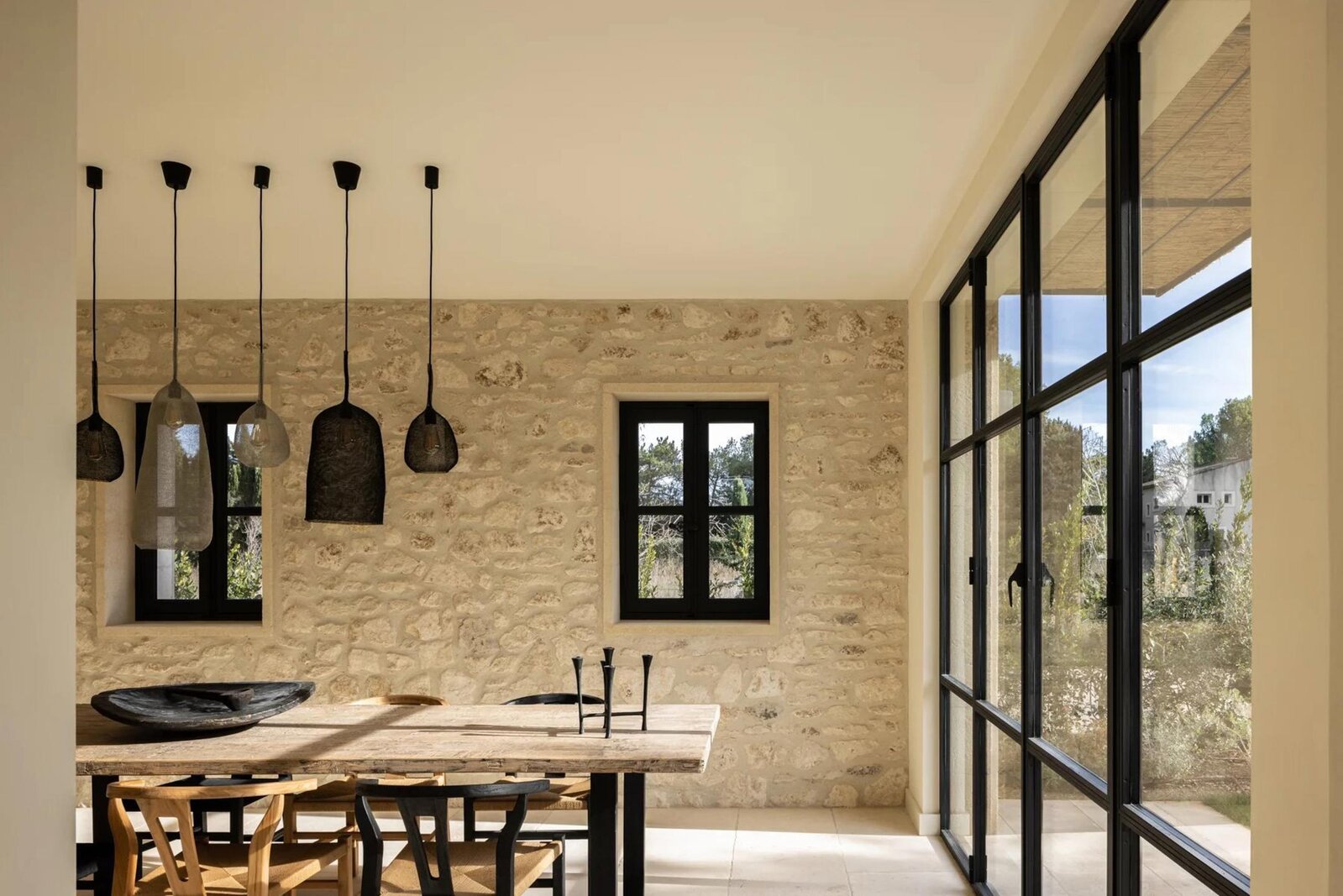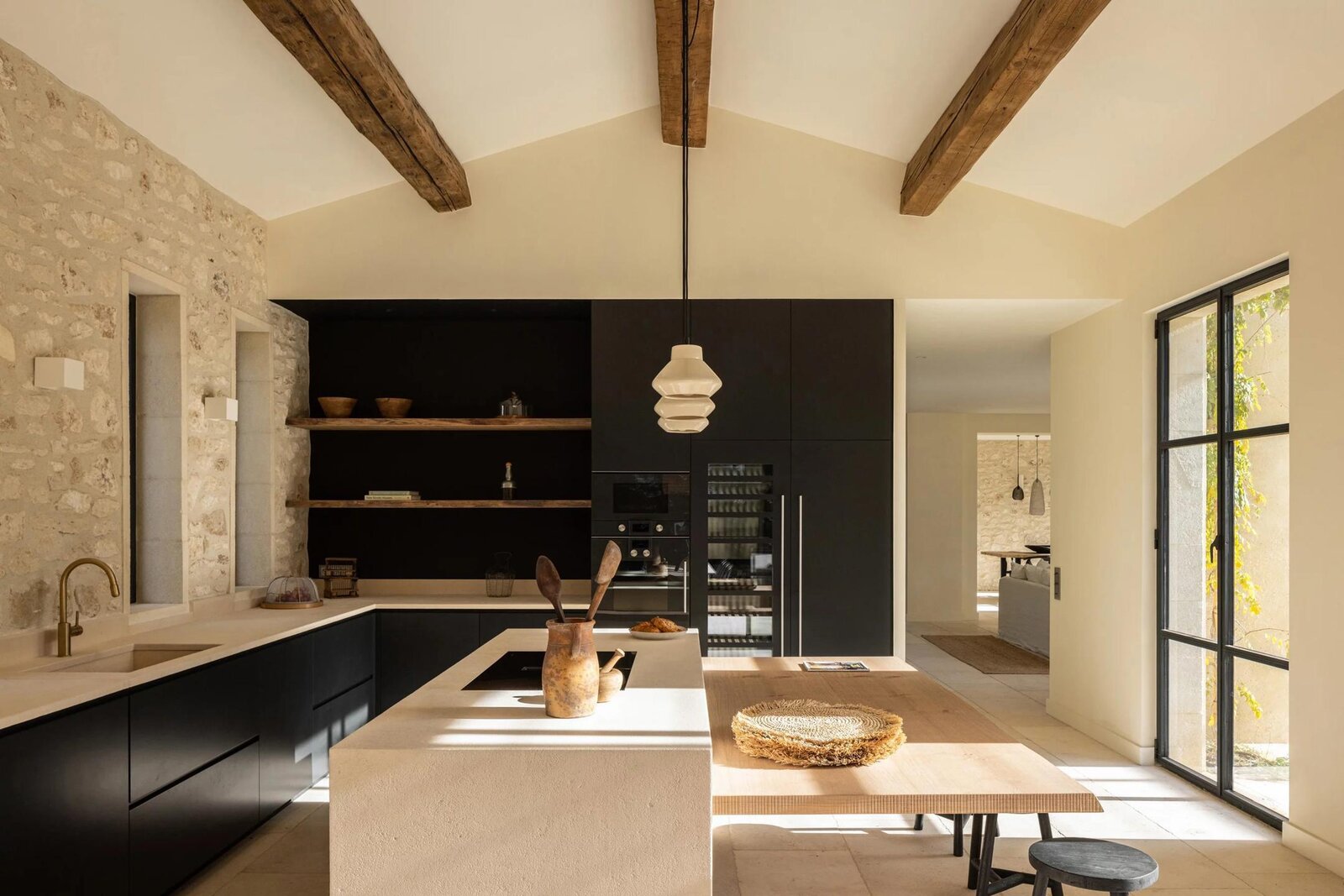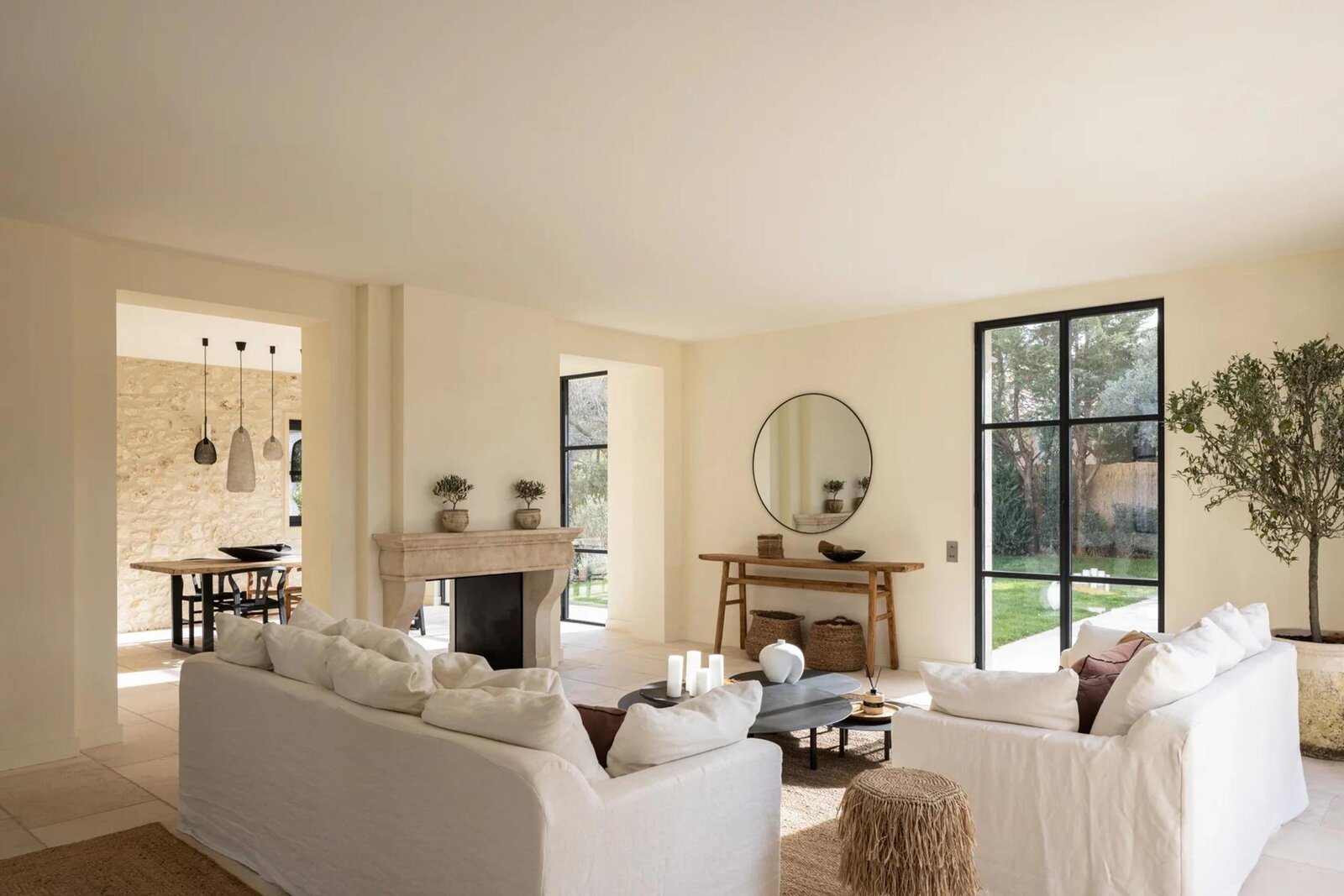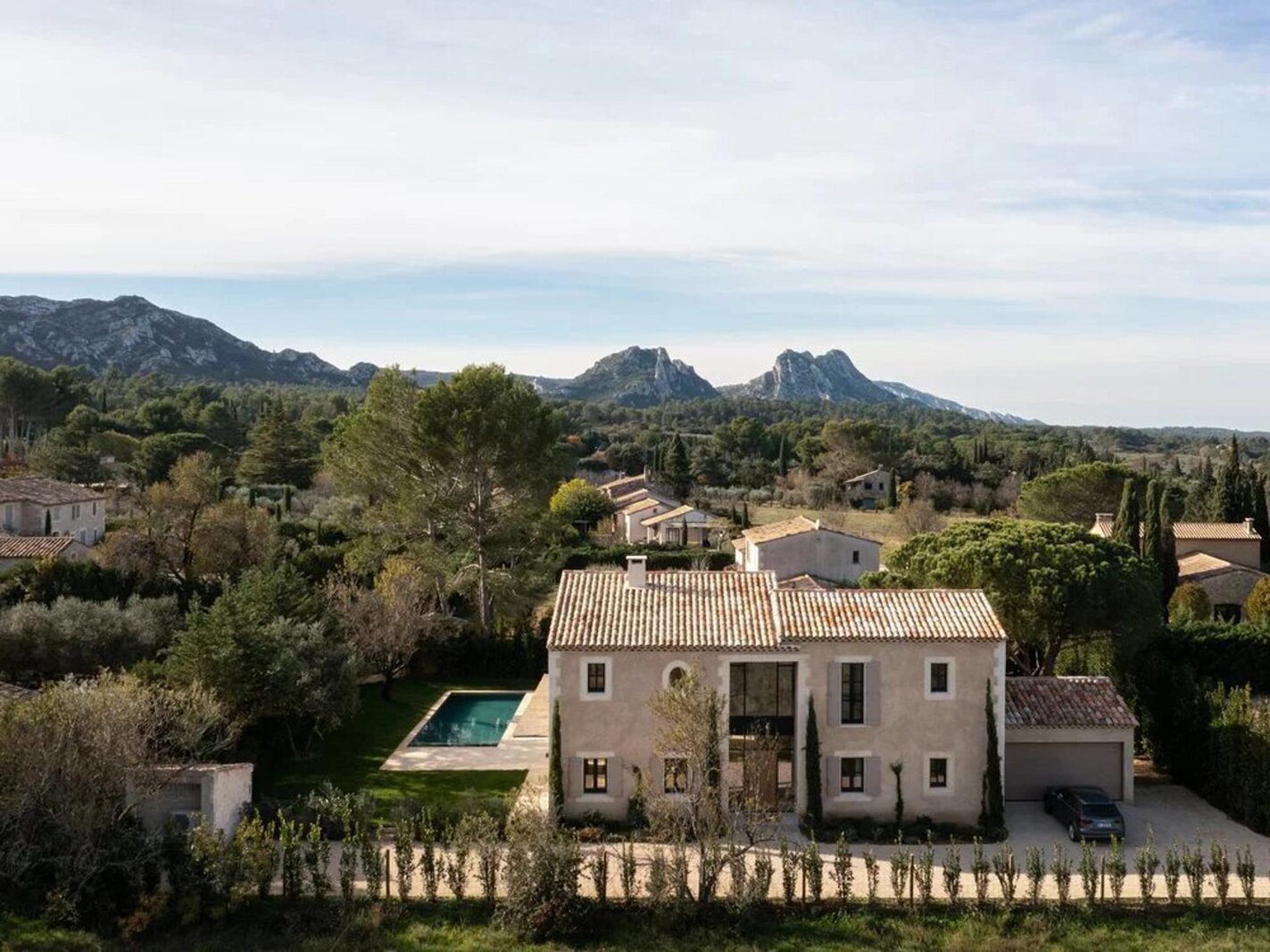 Een oordeelkundige indeling zorgt ervoor dat de woonkamers gescheiden zijn en tegelijkertijd de indruk geven van open ruimtes en gevarieerde perspectieven op de Alpilles en het oude dorp. De eetkamer en de woonkamer, gescheiden door een dubbele open haard, komen uit op het terras en de tuin, de volledig uitgeruste keuken komt uit op een zomerkeuken met barbecue.