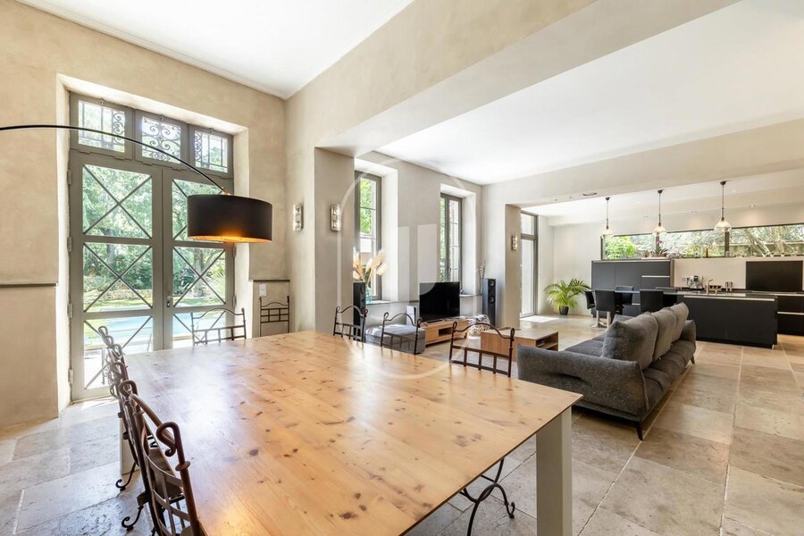 Outside, the property seduces with its sparkling swimming pool and its mature garden, creating an oasis of tranquility and greenery. Spacious parking, a garage and a 30m² cellar complete the services of this residence, making this house an ideal place for a large family, for those who wish to entertain with ease and offering an excellent opportunity for a rental activity.