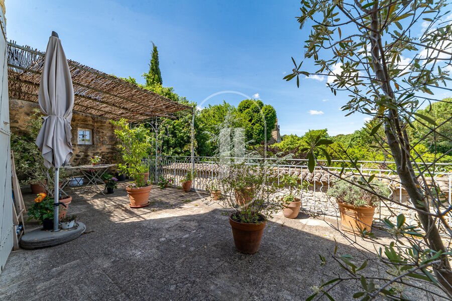 Just 5 minutes from Uzès, in the heart of a sought-after village, this charming village house of approximately 170 sqm captivates with its elevated position and sweeping views over the surrounding countryside. Perched on a limestone promontory like a watchtower set in stone, the house unfolds its suspended terraces towards the horizon, offering living paintings of nature — all the way to the majestic Mont Bouquet, a true symbol of the Uzège region.