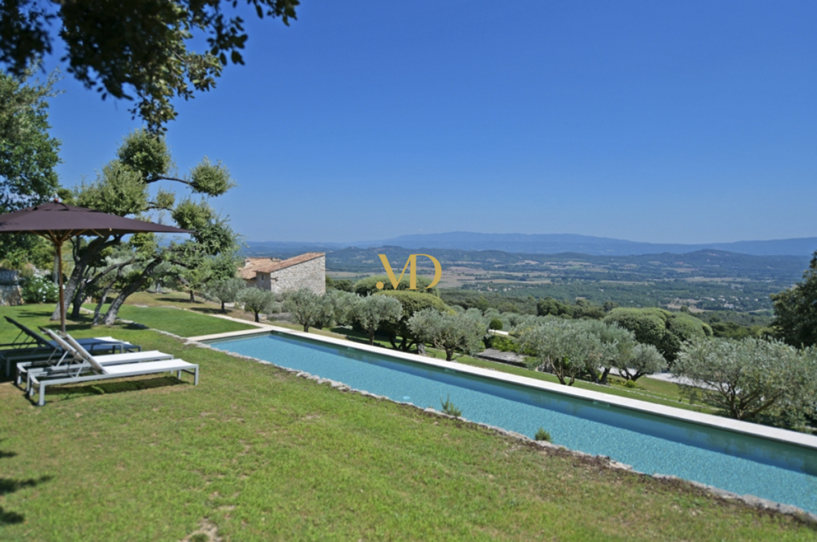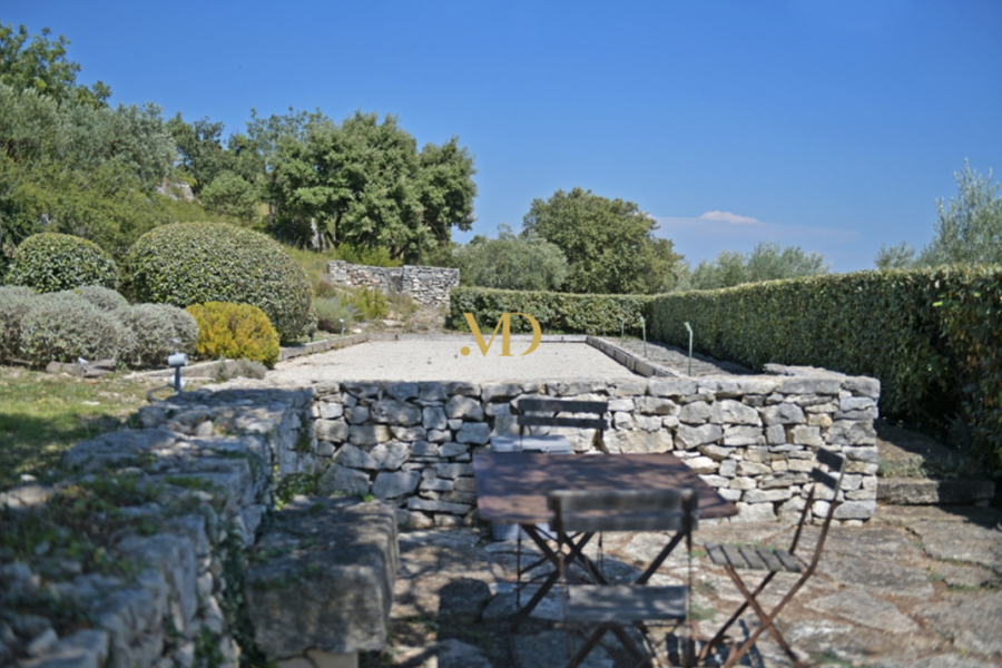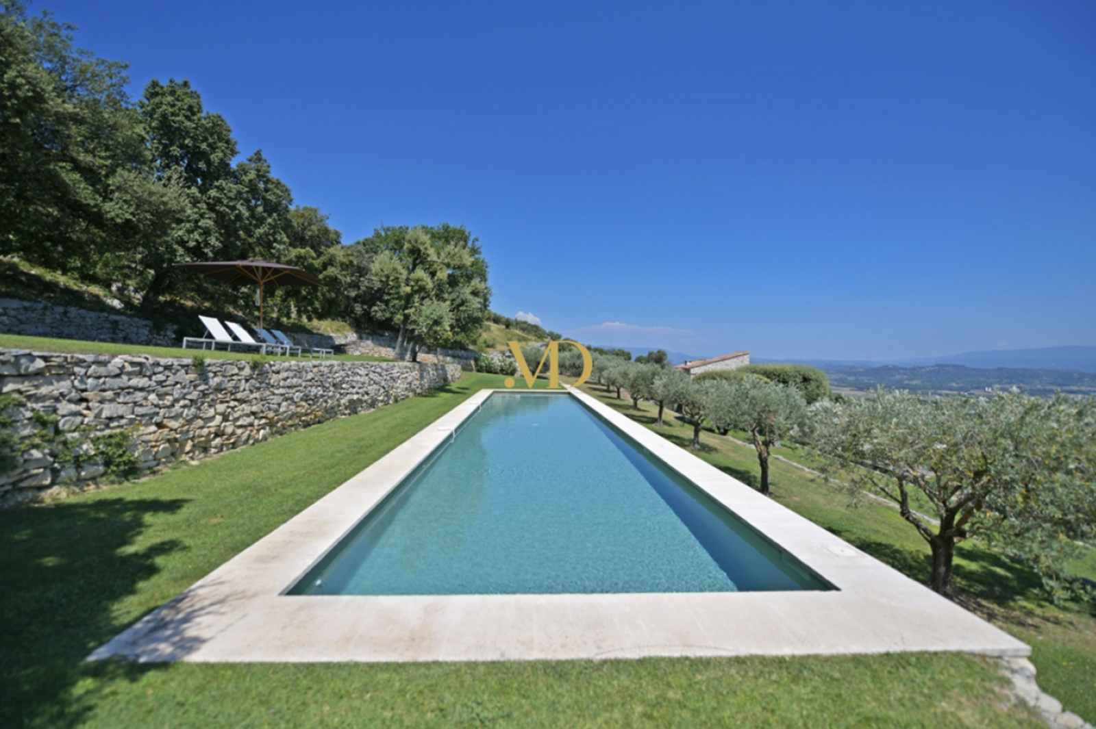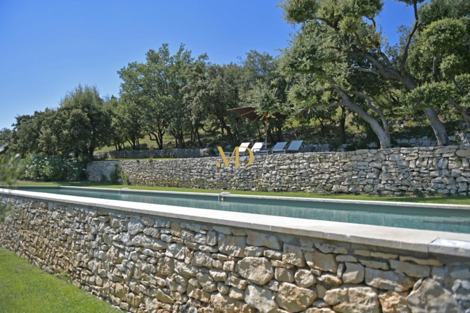 Ook de buitenruimtes zijn opmerkelijk. Voor de woning ligt een ruim terras met een oud waterbassin, een stenen put en een petanquebaan. Lager gelegen, op de restanques, bevinden zich een oude stenen bijenstal, schaduwrijke ontspanningsplekken en vervolgens een uitzonderlijk zwembassin van 20 bij 4 meter, tegen de heuvel aangelegd en met een adembenemend panoramisch uitzicht over de vallei. De landschappelijke integratie is perfect, omringd door gazon en gericht op de horizon.
