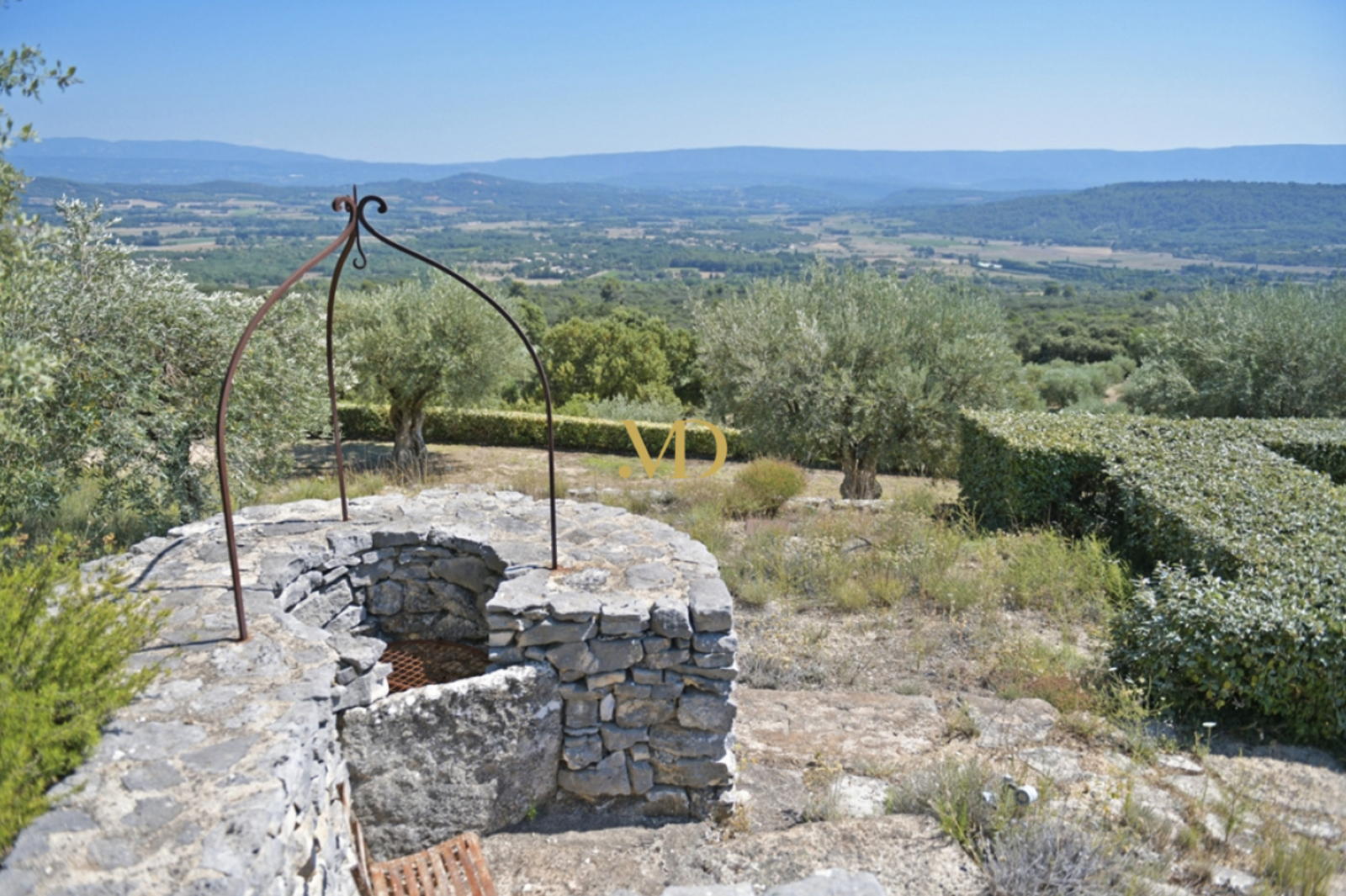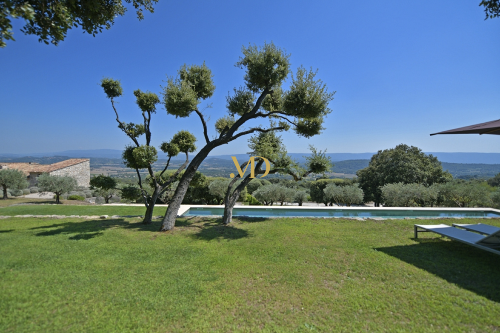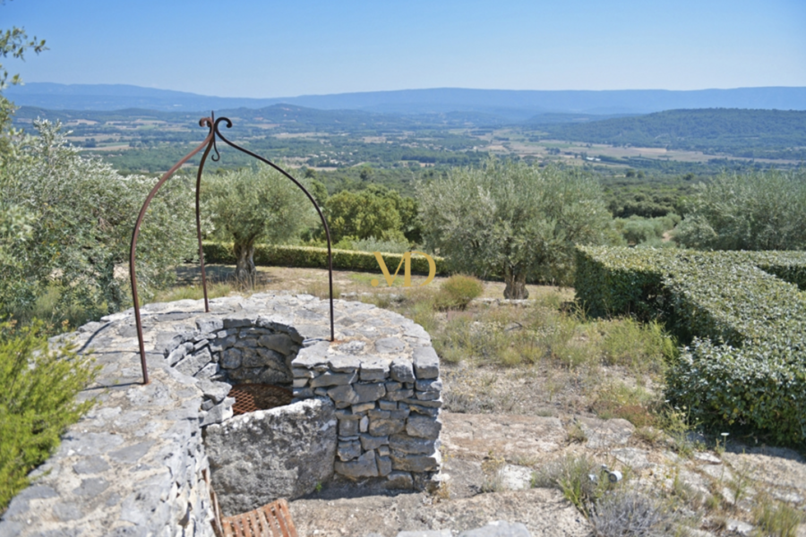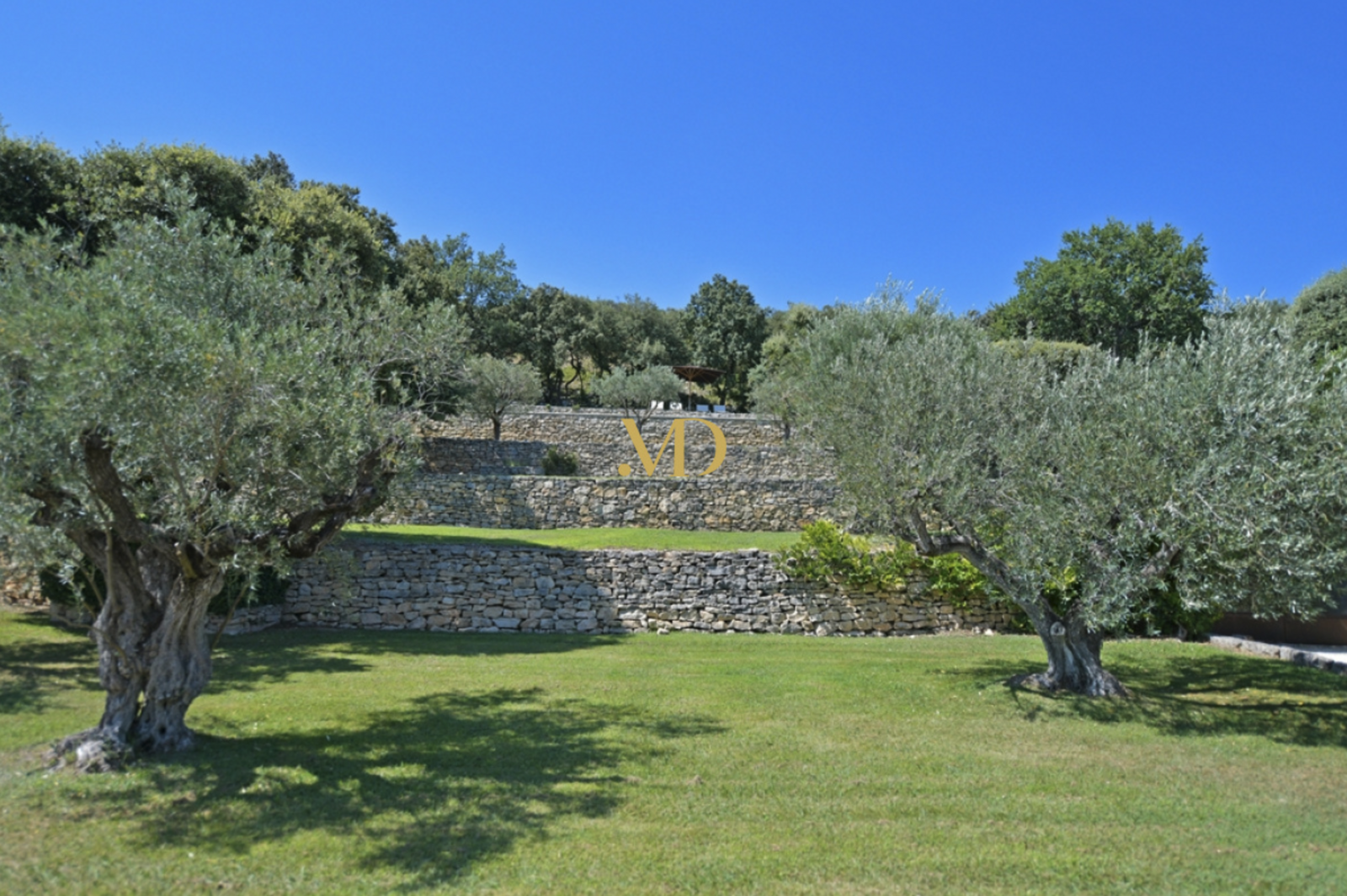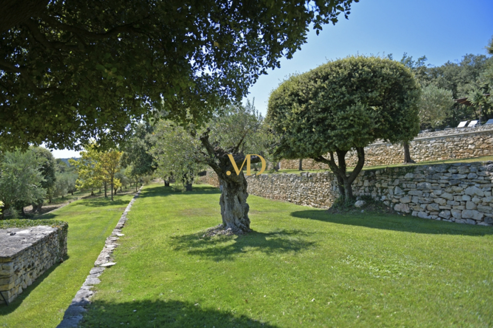 Ook de buitenruimtes zijn opmerkelijk. Voor de woning ligt een ruim terras met een oud waterbassin, een stenen put en een petanquebaan. Lager gelegen, op de restanques, bevinden zich een oude stenen bijenstal, schaduwrijke ontspanningsplekken en vervolgens een uitzonderlijk zwembassin van 20 bij 4 meter, tegen de heuvel aangelegd en met een adembenemend panoramisch uitzicht over de vallei. De landschappelijke integratie is perfect, omringd door gazon en gericht op de horizon.