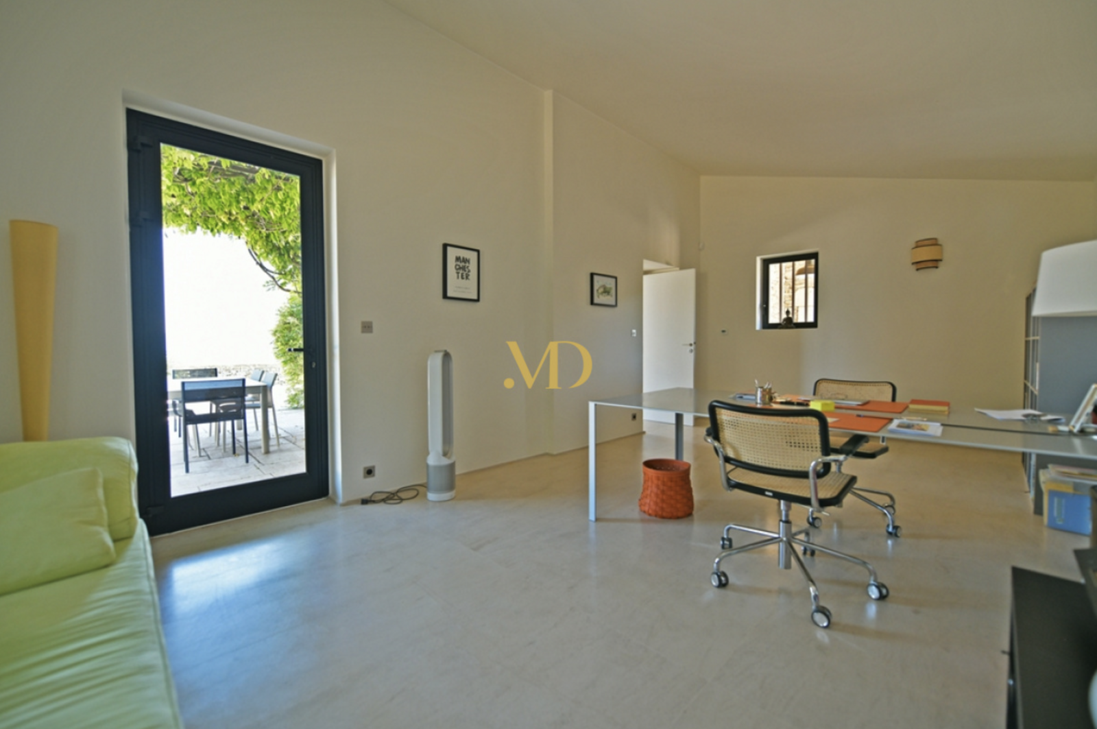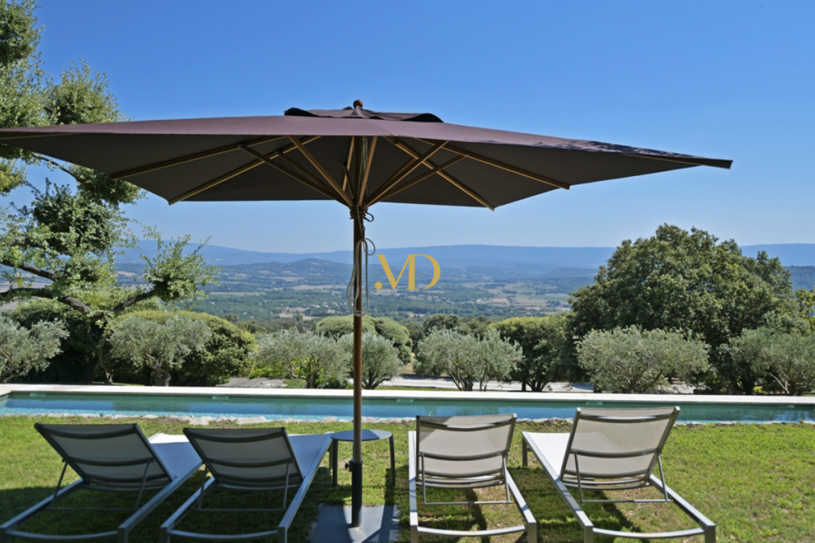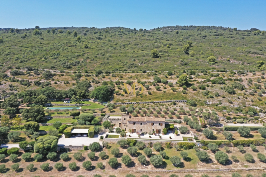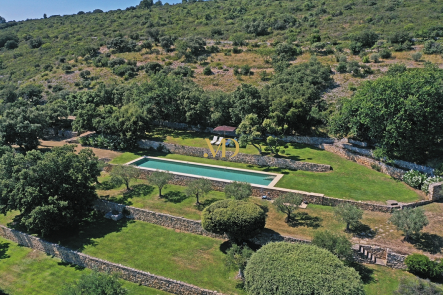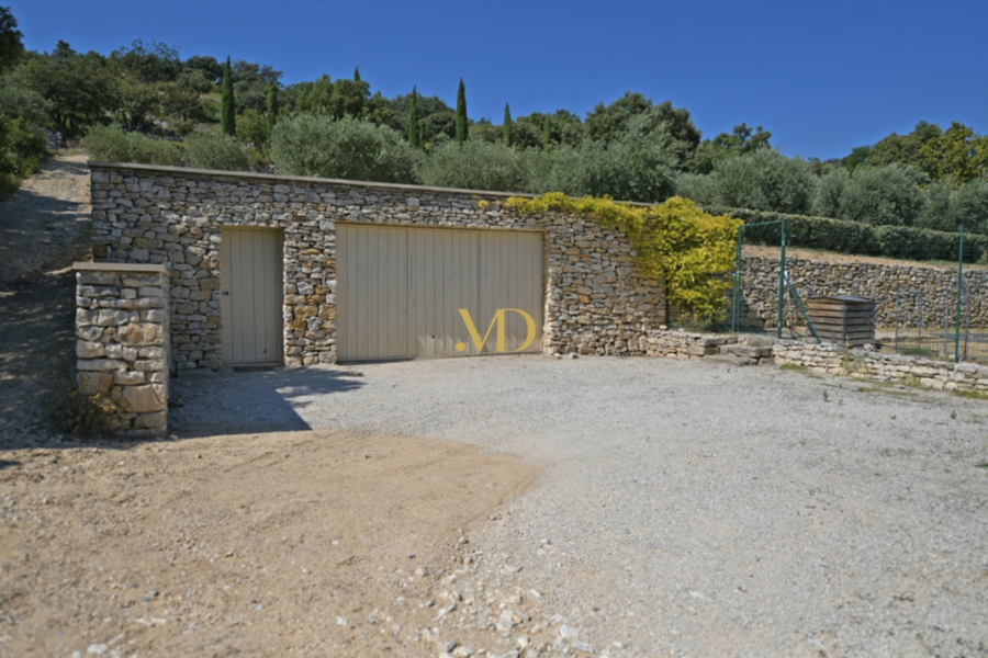 Ook de buitenruimtes zijn opmerkelijk. Voor de woning ligt een ruim terras met een oud waterbassin, een stenen put en een petanquebaan. Lager gelegen, op de restanques, bevinden zich een oude stenen bijenstal, schaduwrijke ontspanningsplekken en vervolgens een uitzonderlijk zwembassin van 20 bij 4 meter, tegen de heuvel aangelegd en met een adembenemend panoramisch uitzicht over de vallei. De landschappelijke integratie is perfect, omringd door gazon en gericht op de horizon.