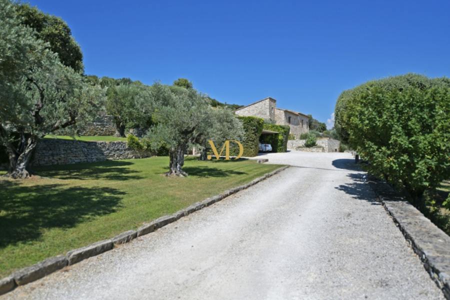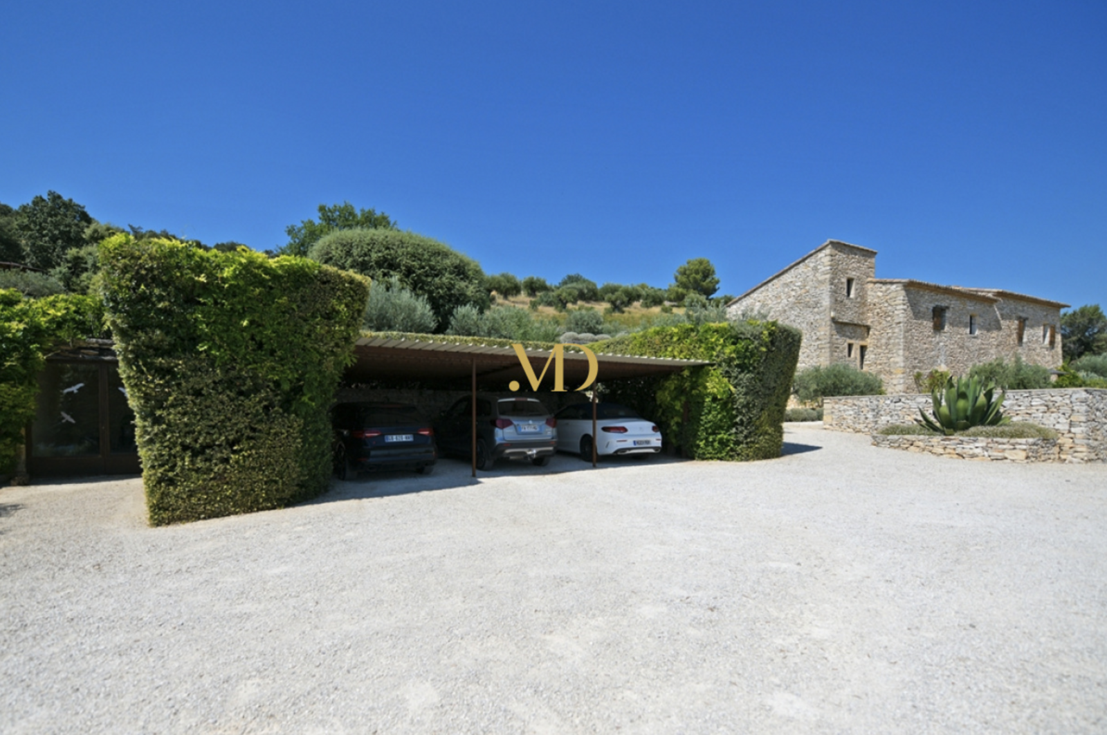 De toegang verloopt via een discreet pad dat door de garrigue slingert en leidt naar een geautomatiseerde poort die uitkomt op een lange oprijlaan, omzoomd door olijfbomen. Deze leidt naar een aangelegde parkeerzone, waarvan een deel overdekt is met een pergola.