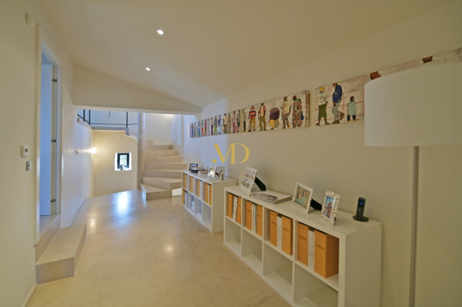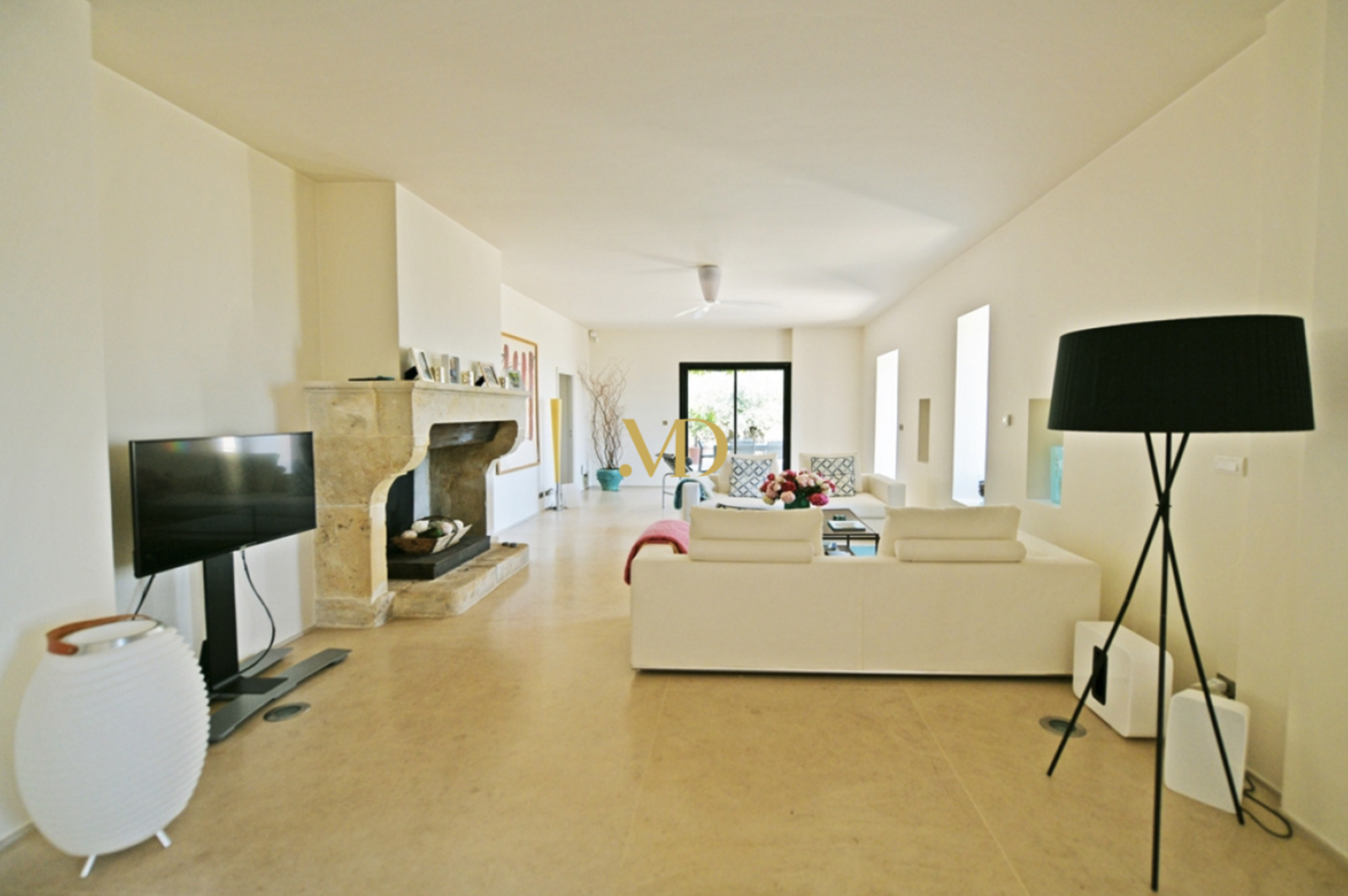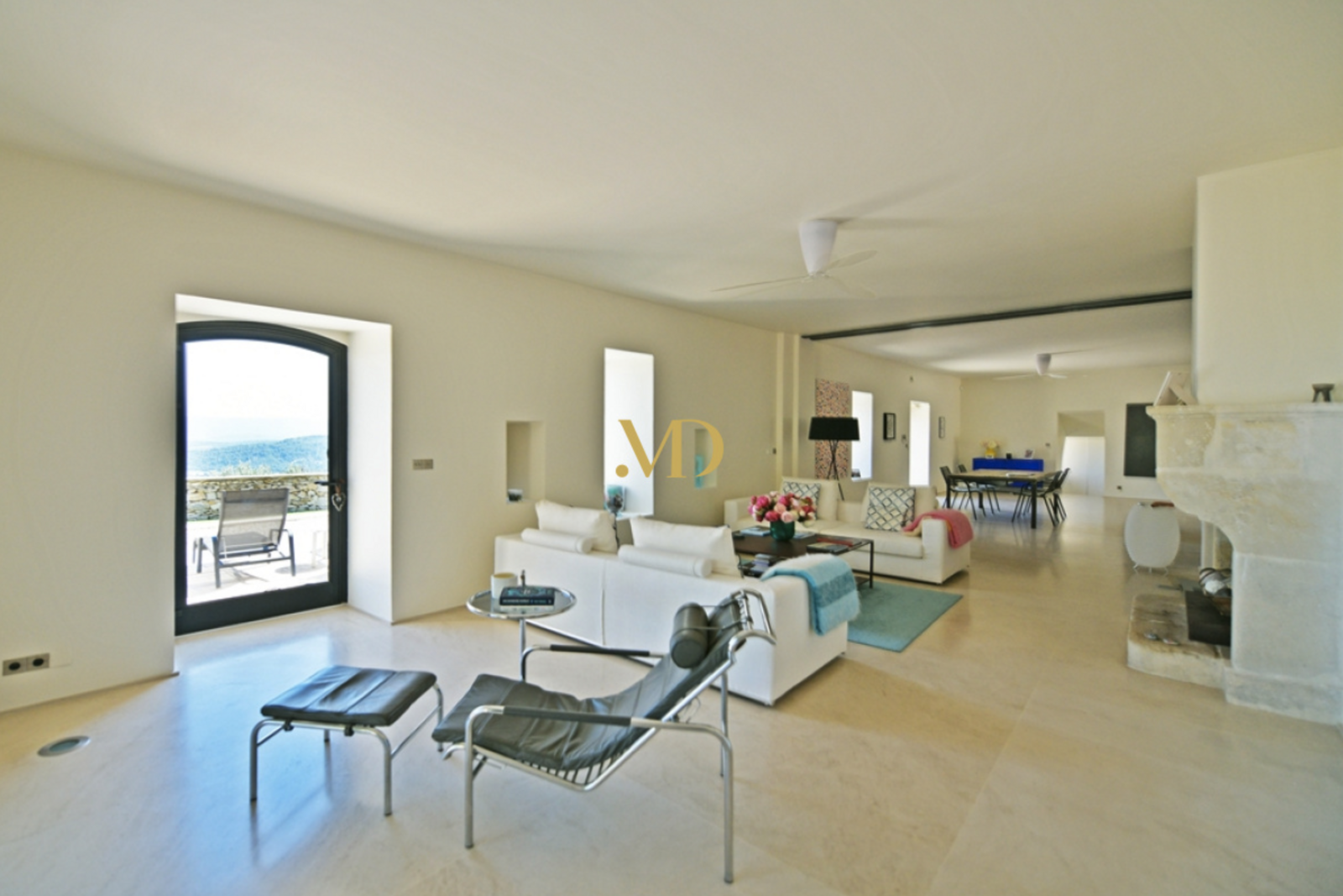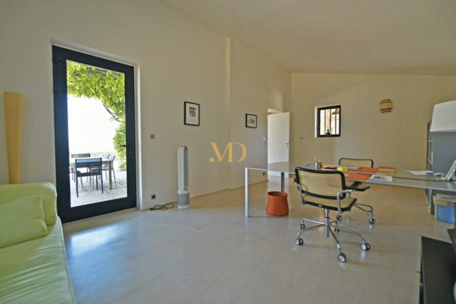 Het hoofdgebouw omvat ongeveer 300 m² bewoonbare oppervlakte en is georiënteerd rond ruime terrassen met gazon en natuurstenen bestrating, die uitnodigen om ten volle van het panorama te genieten. De binnenruimtes zijn royaal en baden in het licht. Op het hoofdniveau bevindt zich een doorzonleefruimte: aan de salonzijde zorgt een 18e-eeuwse stenen open haard voor karakter en warmte, verlengd door een tweede, intiemere zithoek. Aan de andere zijde is de eetkamer georganiseerd rond een indrukwekkend centraal kookeiland, waarachter een volledig uitgeruste, hedendaagse keuken schuilgaat. Een bijkeuken met wasruimte geeft toegang tot een overdekt terras op het noorden. Dit niveau wordt vervolledigd door een ruime bureau met pergola, evenals een vestiaire en gastentoilet.