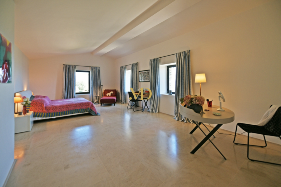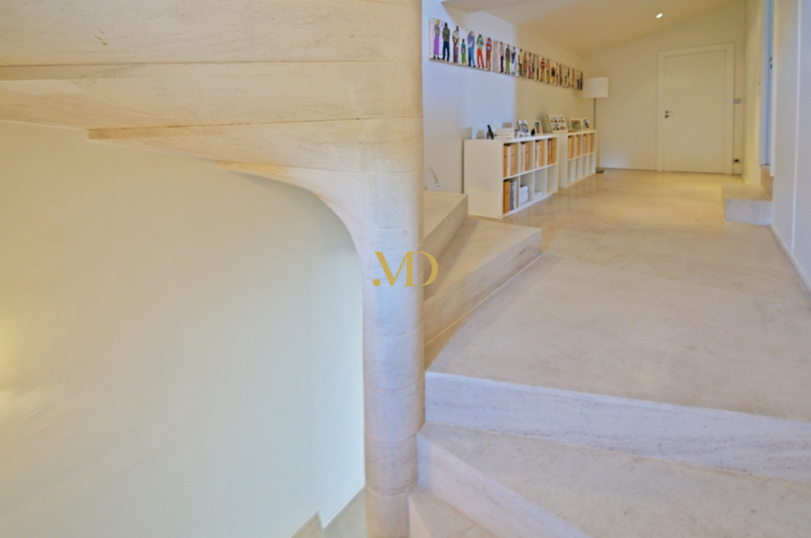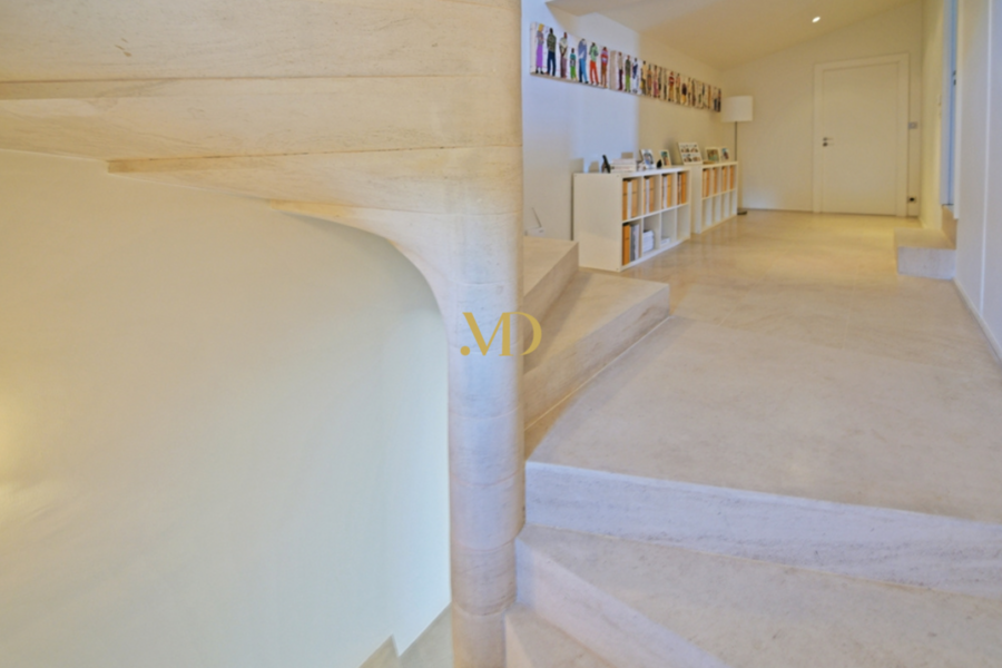Een elegante stenen trap leidt naar de verdieping, waar een ruime overloop ingericht als leeshoek toegang geeft tot twee suites. De eerste, bijzonder ruim, omvat een zithoek, een bureau, een dressing en een volledige badkamer met douche, hammam en apart toilet. De tweede slaapkamer beschikt eveneens over een eigen badkamer en toilet. De trap loopt verder door naar het hoogste niveau, in het voormalige duiventorentje, waar zich een charmante leesruimte bevindt.