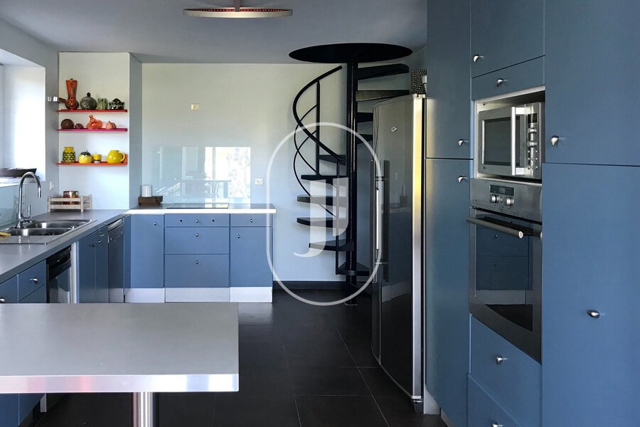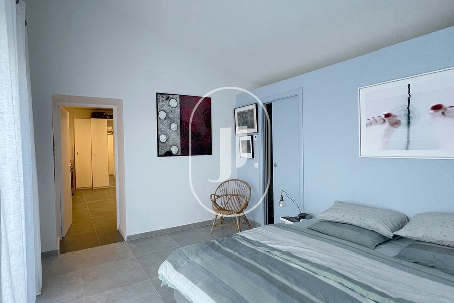 The garden level, bathed in light through large sliding bay windows, offers a spacious living room with insert fireplace and “starry sky” ceiling lighting, opening onto a large sunny terrace perfect for relaxation. The bright kitchen and dining room with remarkable ceiling height create a welcoming space ideal for entertaining. A stylish master suite with shower room, dressing area and direct access to the garden completes this level.