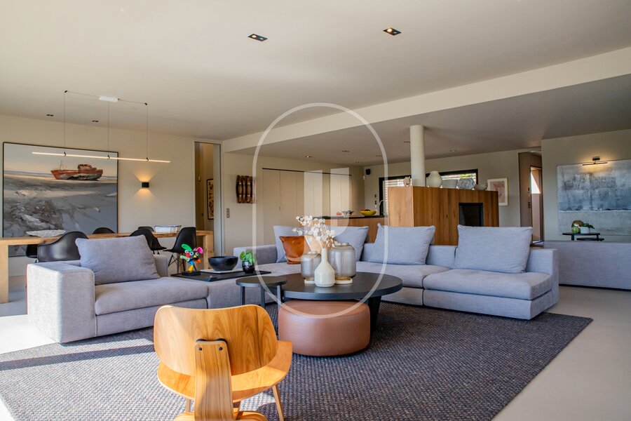 The spacious and harmonious interior features a vast open-plan living area with kitchen and dining space, designed for comfort and conviviality, and fitted with ample built-in storage.
