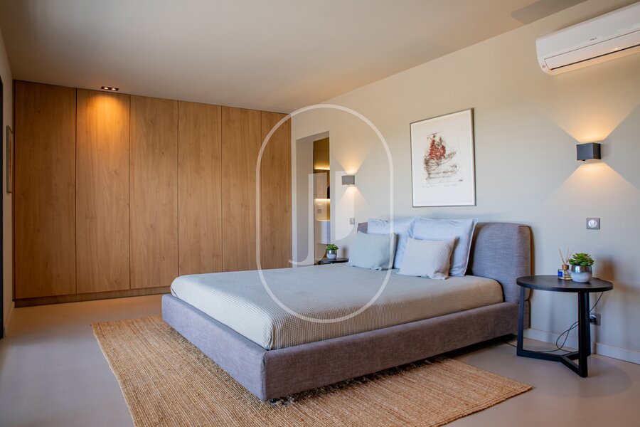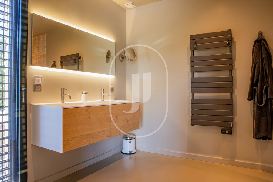 High-end features include double glazing, electric shutters, polished concrete floors, floor heating and cooling, reversible air conditioning, 8 kW photovoltaic panels, automatic gate, illuminated 200 meters private driveway, alarm and videophone.