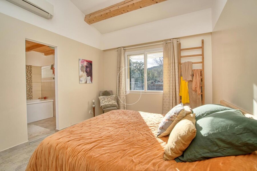 This house for sale in La Garde Freinet offers around 160 sqm of interior space. Outside, there is ample parking, a large shaded terrace and an above-ground swimming pool. Just a short drive from the property, La Garde Freinet is a picturesque village in the Gulf of Saint-Tropez, renowned for its natural beauty and peaceful atmosphere.