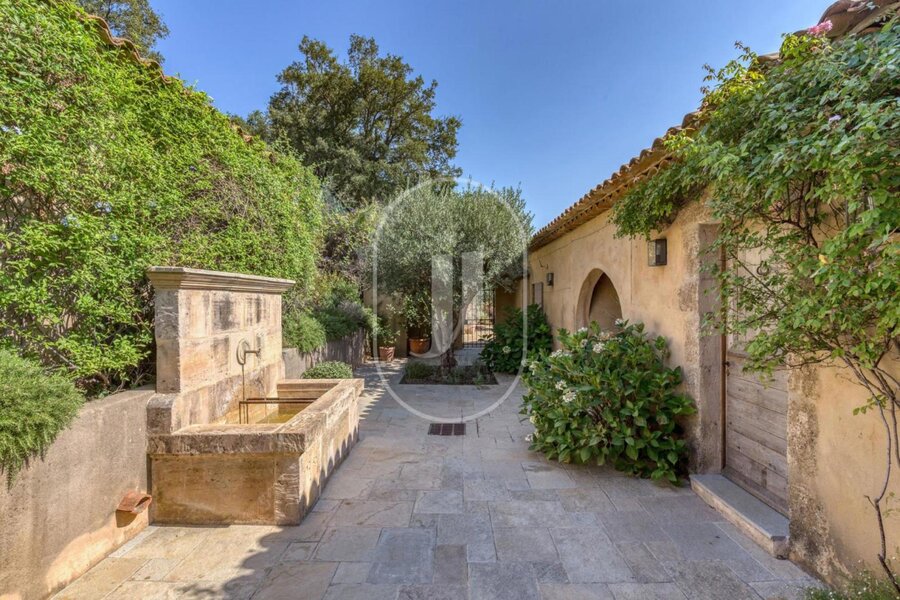 The same entrance patio provides access to a third en-suite bedroom with a separate entrance so that friends, family or even an employee (chef, au pair etc.) can be accommodated in complete privacy. Also entered from outside the house for complete independence, a private apartment has been fitted out with a kitchen and has a clear view of the countryside. The house has hot/cold air conditioning throughout and has a borehole with UV and sand filters and two water tanks to supply the property with water. There is the possibility of a second borehole. The garden features a heat-pump-heated infinity pool and several shaded terraces looking out on the countryside. A double garage, a big parking area and two storage sheds are also included.