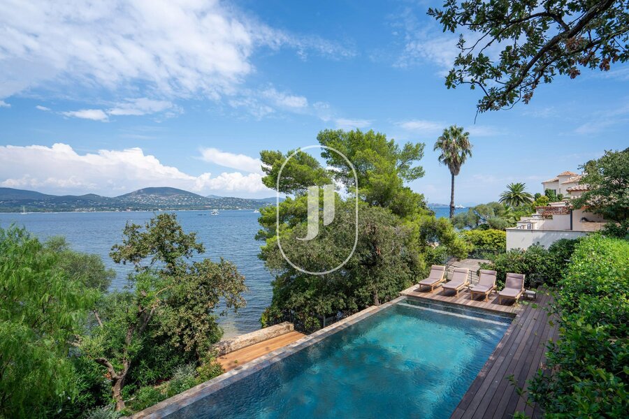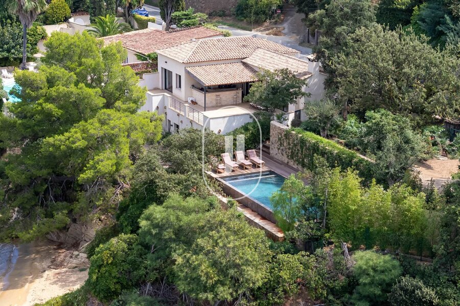 This property offers you the exceptional privilege of having your own beach nestling in the greenery, sheltered from view, and a boat garage. The two-storey villa of around 170m² was renovated in 2019. All the rooms of the house face the sea and are composed as follows: a bright living room with fireplace, a fully equipped open-plan kitchen, a large pantry and a first suite with shower room and dressing room, all opening onto a lovely terrace with outdoor kitchen. The lower floor comprises three bedrooms with en suite shower rooms and direct access to a second terrace. The grounds are planted with trees, have a sublime infinity pool with teak decking and parking space for three vehicles. This is an exceptional and unique property for sale.