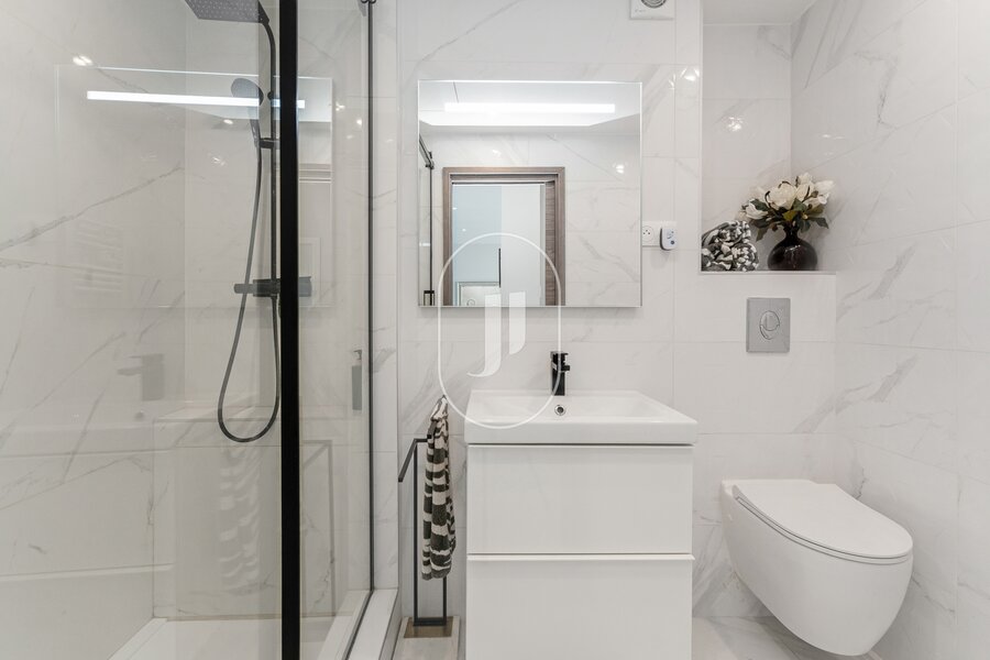 The apartment offers two spacious bedrooms, one of which includes built-in wardrobes, and a modern shower room equipped with a walk-in shower and toilet.