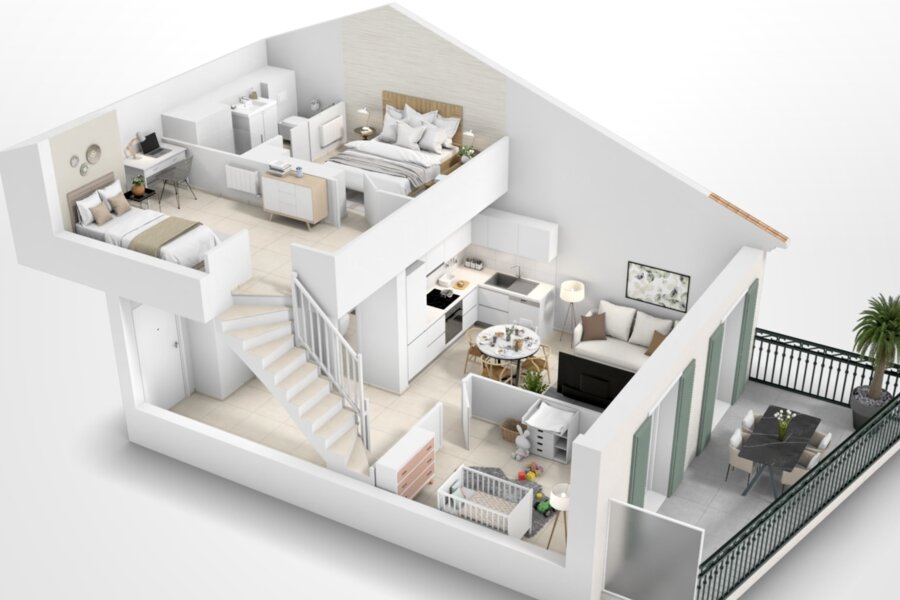 The second apartment (T3) is located on the second floor (R+2) and has two bedrooms and two bathrooms, a kitchen/living room and an office. The apartment has a surface area of 79.25m2 and costs €1,350,000.