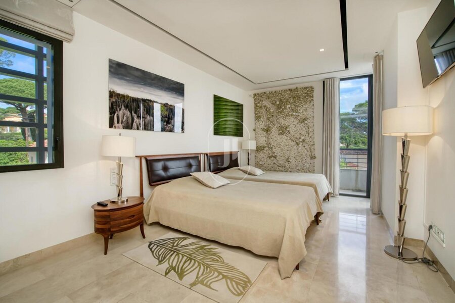 The apartment also benefits from a cellar, two garages, two private parking spaces and a private rooftop swimming pool. Luxury seafront apartment for sale in the Sainte-Maxime real estate agency.