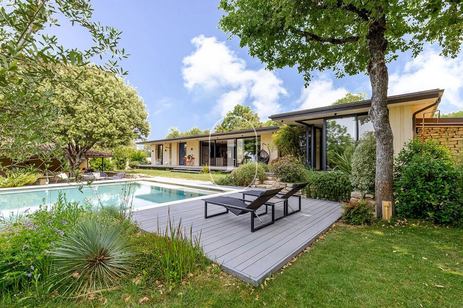 Occupying a commanding position in prestigious surroundings, this magnificent ca. 215 sqm single-storey contemporary villa was built in 2020 using high-quality materials, including a timber frame that lends it a unique charm. Benefiting from a due-southerly aspect and an unbeatable view of the Luberon mountains, the property presents an exceptional living environment combining modern style with comfort.
