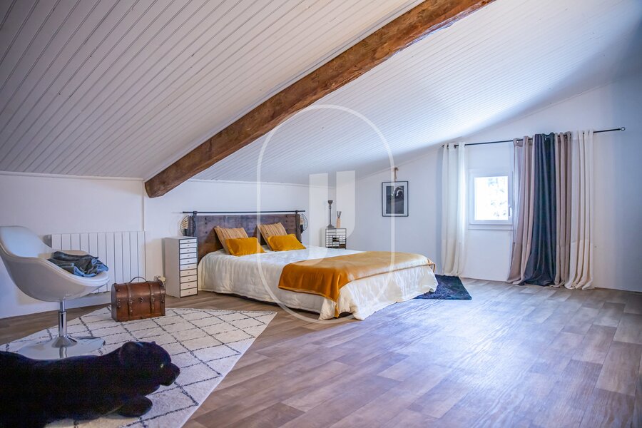 Dwelling 1 is located to the east. On the ground floor, you will discover an entrance, an equipped kitchen with a living room fireplace and a TV room with beautiful old beams and the charm of the stone floor, two bedrooms complete this level with a shower room and WC. The floor is accessed by a very beautiful traditional Provençal staircase that leads to a large attic room and a convertible attic.