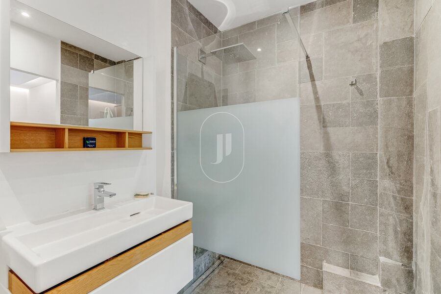 The master suite, approximately 26 m², includes a private shower room, Japanese toilet, and a beautifully crafted custom walk-in wardrobe. A second bedroom also benefits from its own en-suite shower room. Both bedrooms and the bathrooms face the building’s quiet inner courtyard, ensuring privacy and calm.