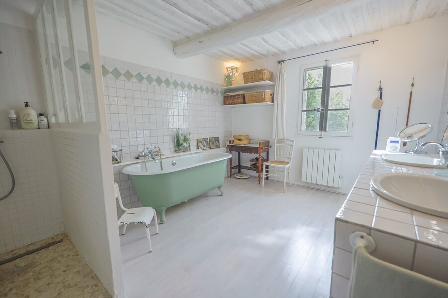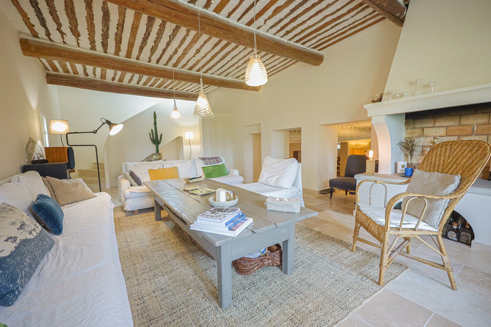 Op het gelijkvloers beschikt de bastide over een ruime leefruimte met open keuken en eetkamer, evenals een lichtrijke salon met open haard, uitgevend op een terras met panoramisch uitzicht.