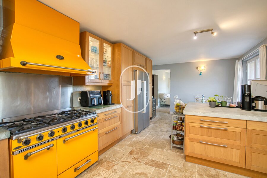 The ground floor comprises an entrance hall, a vast lounge with wood-burning stove and a living room with open-plan kitchen enhanced by its Godin piano; the whole opens onto a vast terrace with a commanding view. A storeroom-laundry room, a large storage room that could be converted into a home cinema or living area by creating an opening, and a cellar complete this level.