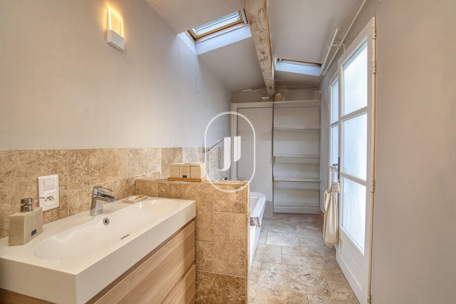 The first floor features a huge living room with high ceilings and large beamed trusses, opening onto terraces and access to the atypical patio with its jacuzzi. This peaceful area is protected from all winds and can also be accessed via the master suite.