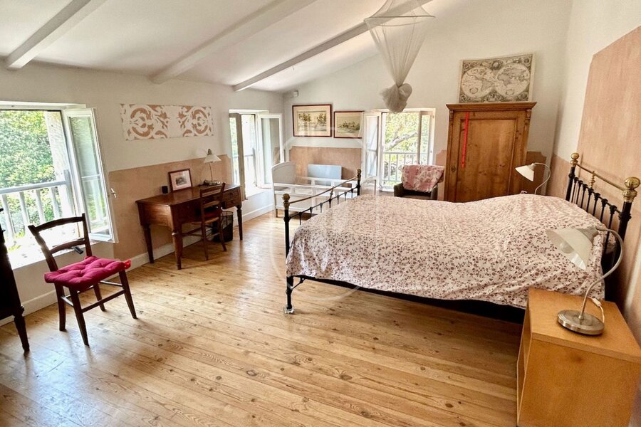 The main house with an area of approximately 130 sqm is on 2 levels, with on the garden level a large living room of 30 sqm with fireplace, a large living kitchen of 20 sqm with fireplace, 1 small bedroom with shower room and wc. Upstairs, 3 beautiful bedrooms including a master suite of 27 sqm with private bathroom with wc, and a 2nd bathroom with wc.