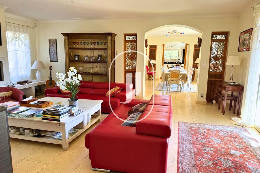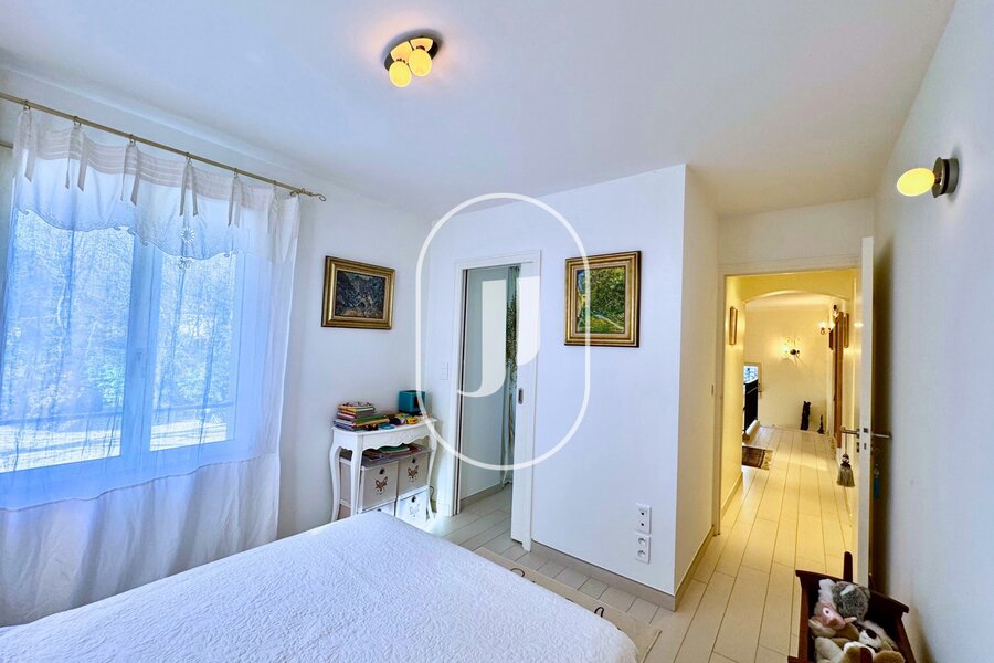 The garden level comprises an entrance hall, a spacious 60 m² reception room, a family kitchen, a dining room and a bright living room with fireplace. The master suite, with a fully equipped bathroom, enjoys direct access to the outside.