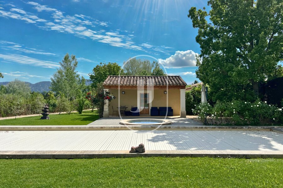 The 3,200 m² landscaped grounds include a terrace, a pool house, a heated swimming pool measuring 15 x 5 m, a jacuzzi, and outdoor areas offering unobstructed views of the surrounding nature and the Alpilles.