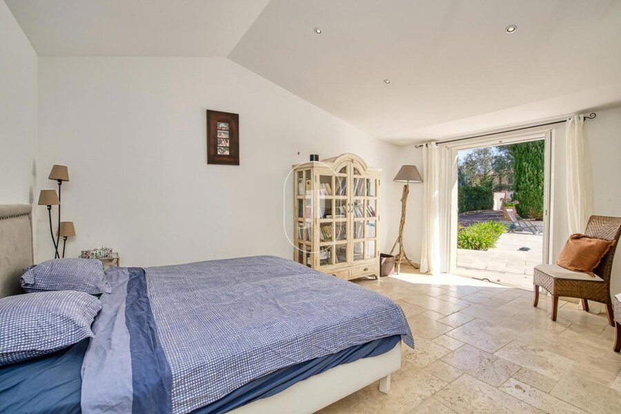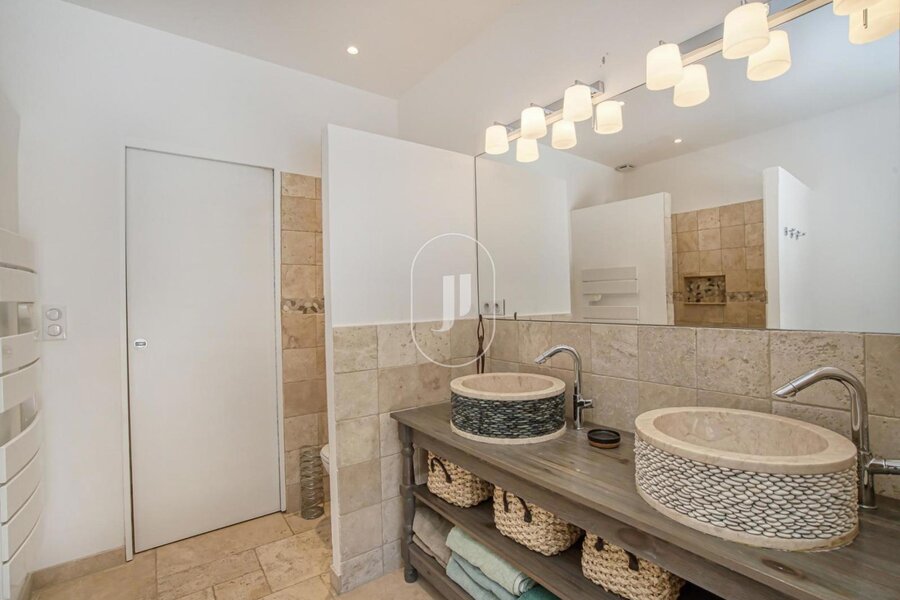 The night area includes three spacious bedrooms, two of which overlook the garden and pool, two shower rooms and one bathroom. The generous ceiling height in each room brings space and comfort.
