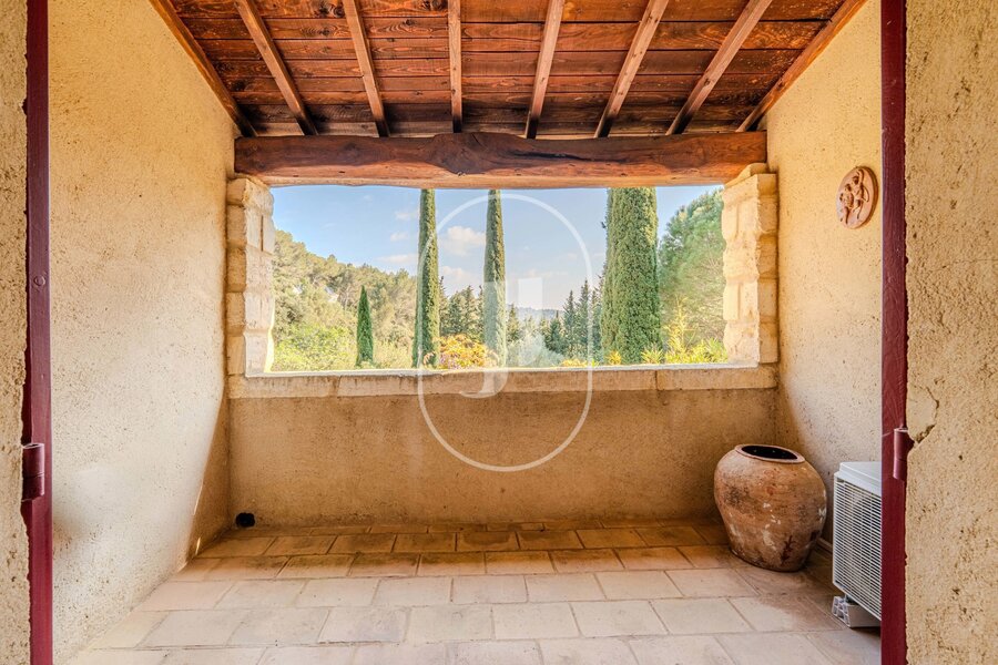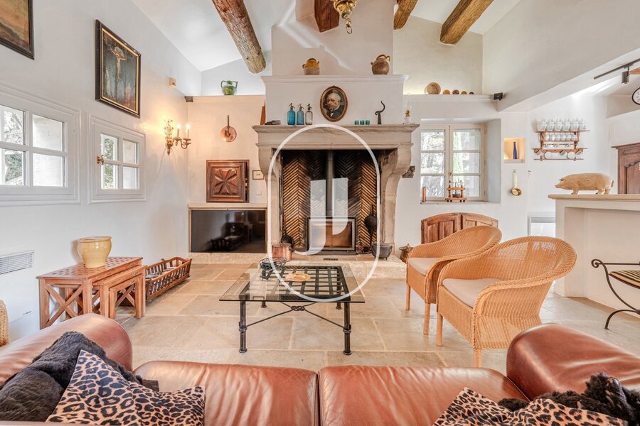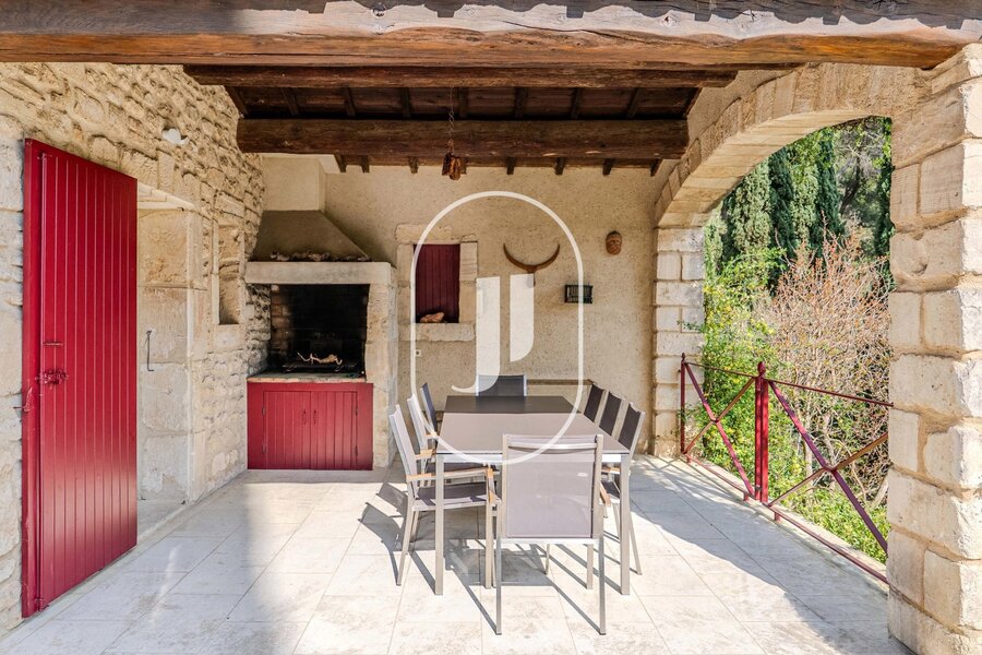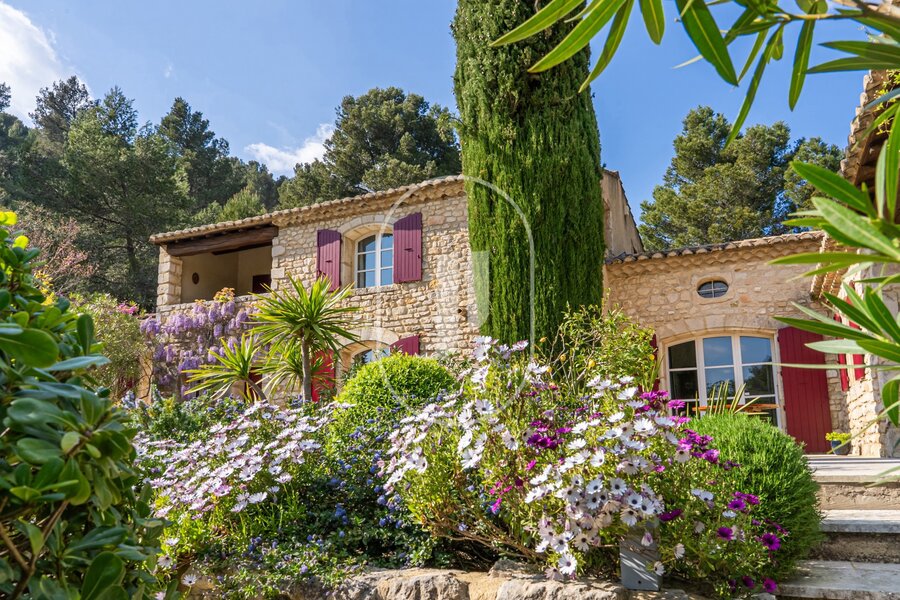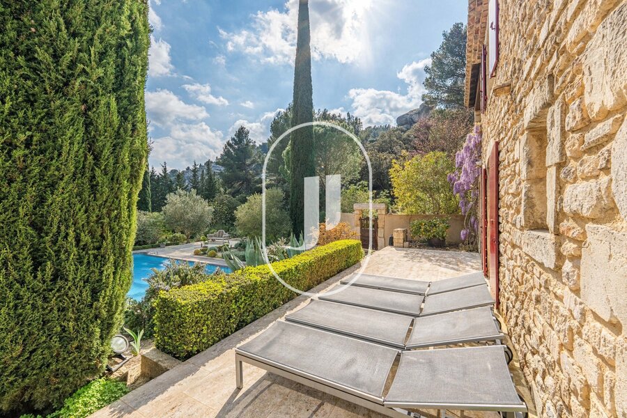 Located in the heart of the Alpilles, in one of the most beautiful villages in France, this elegant stone property charms with its authenticity and exceptional natural surroundings. Nestled in a preserved environment, it enjoys absolute peace, complete privacy, and an outstanding panoramic view of a listed rock.