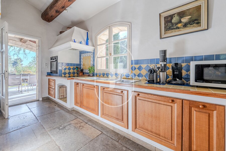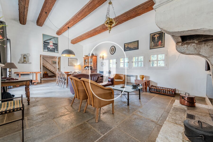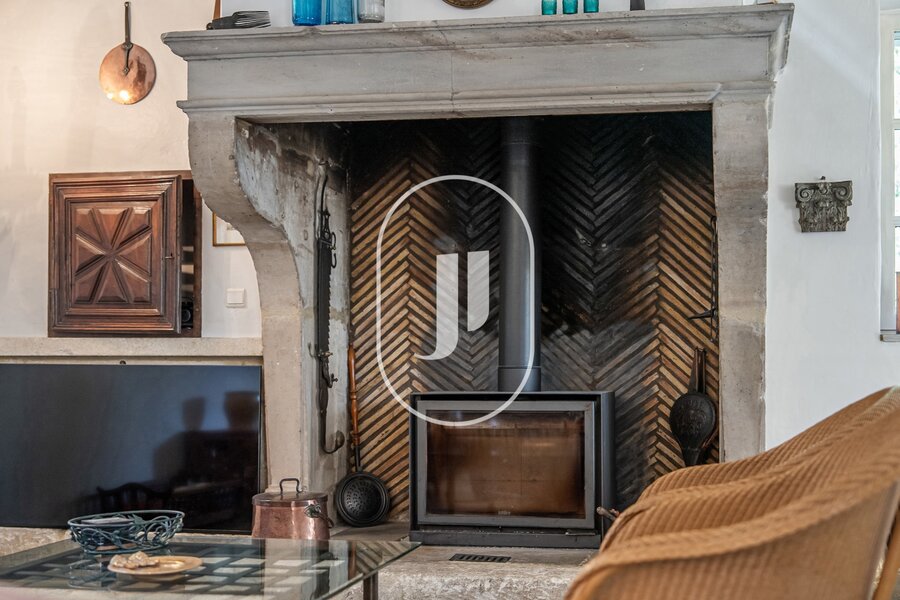 On the ground floor, the entrance hall leads to a guest WC, a large bedroom with en-suite bathroom and direct access to the south-facing terrace. The Provençal-style kitchen is extended by a back kitchen and opens onto a spacious, light-filled living/dining room. This welcoming living area benefits from high ceilings and an impressive fireplace, creating a cosy atmosphere.