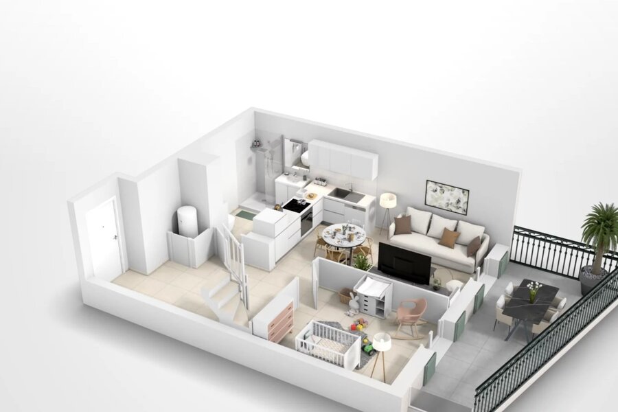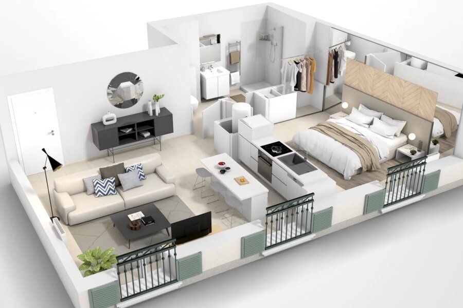The residence consists of 14 apartments, with only two still available. The first, a one-bedroom apartment (T2) on the first floor, features a bedroom, a bathroom, a brand-new kitchen, and a bright living room. It has a surface area of 51.70 m² and is priced at €895,000.