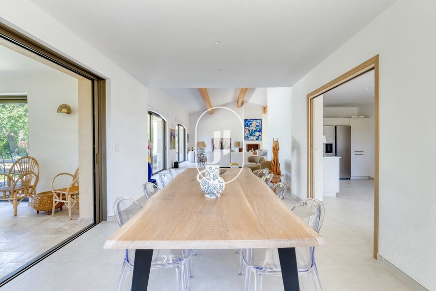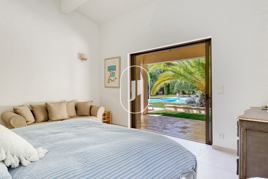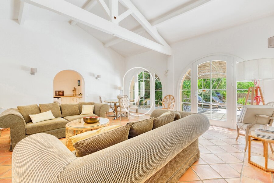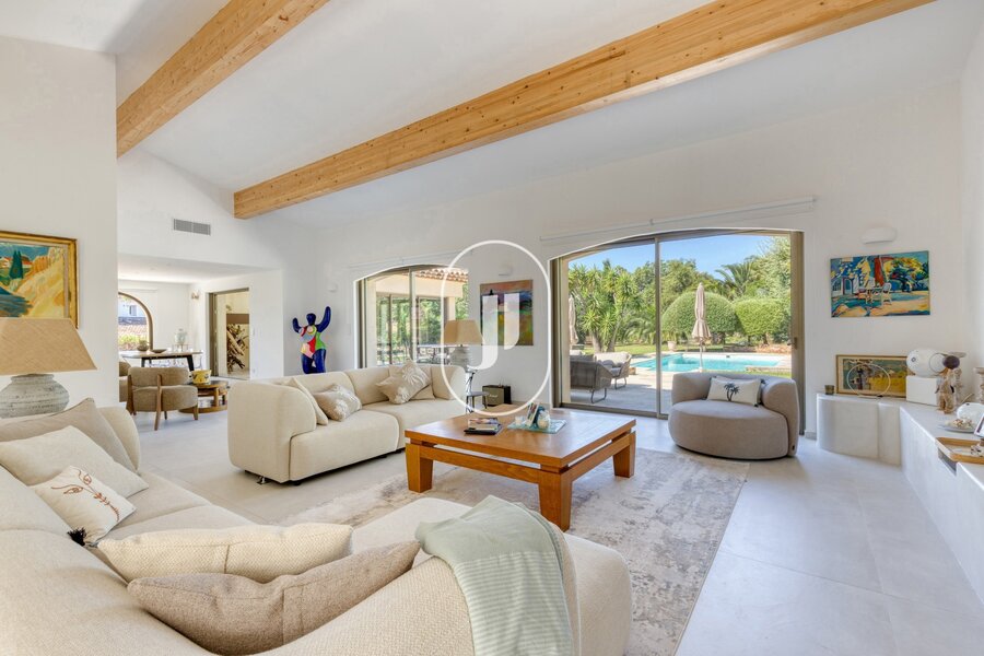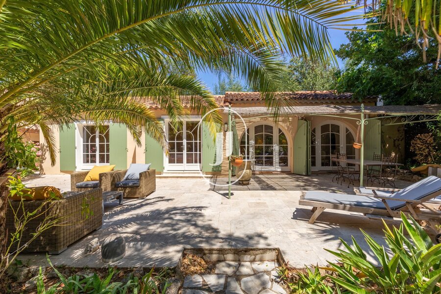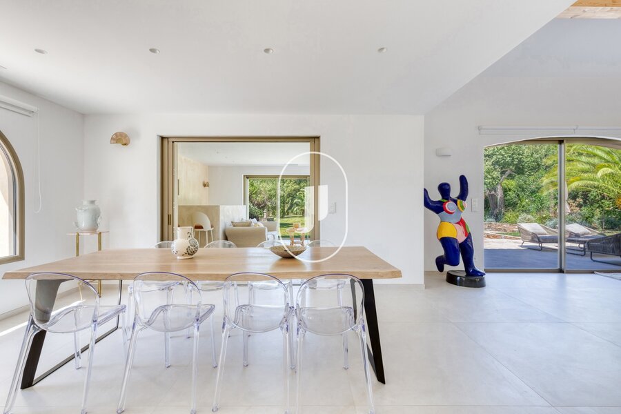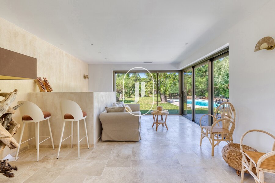 Nestled in a lush green setting in the heart of a sought-after residential area of Grimaud, this exceptional property for sale charms with its peaceful surroundings, within walking distance of the beach and the Beauvallon golf course.
