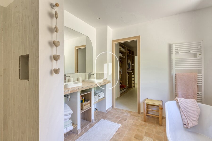 The main villa is brand new and built as a primary residence, with all the comforts and features to prove it. It was completed in 2024 and finished down to the smallest detail. Spanning 230 m², it opens with a proper entrance and guest toilet, leading to a spacious, light-filled living room with high ceilings and a through layout. The architect carefully designed the various volumes to ensure it feels welcoming whether alone or in a group. The kitchen is separate and fully equipped, with a utility room for added convenience. The house includes a master suite and a second guest bedroom.
