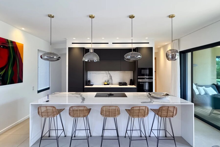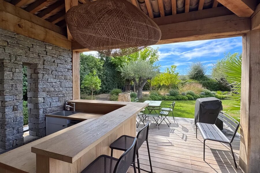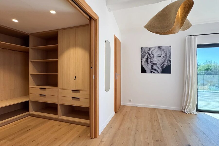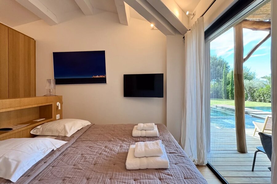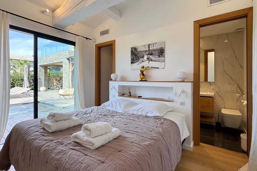 The villa offers five comfortable suites, each with its own bathroom and custom storage. The master suite, located on the upper level, benefits from a private terrace overlooking the garden, providing an intimate and privileged space.