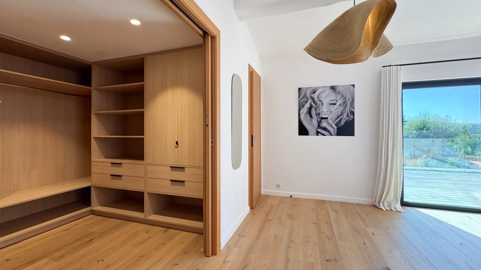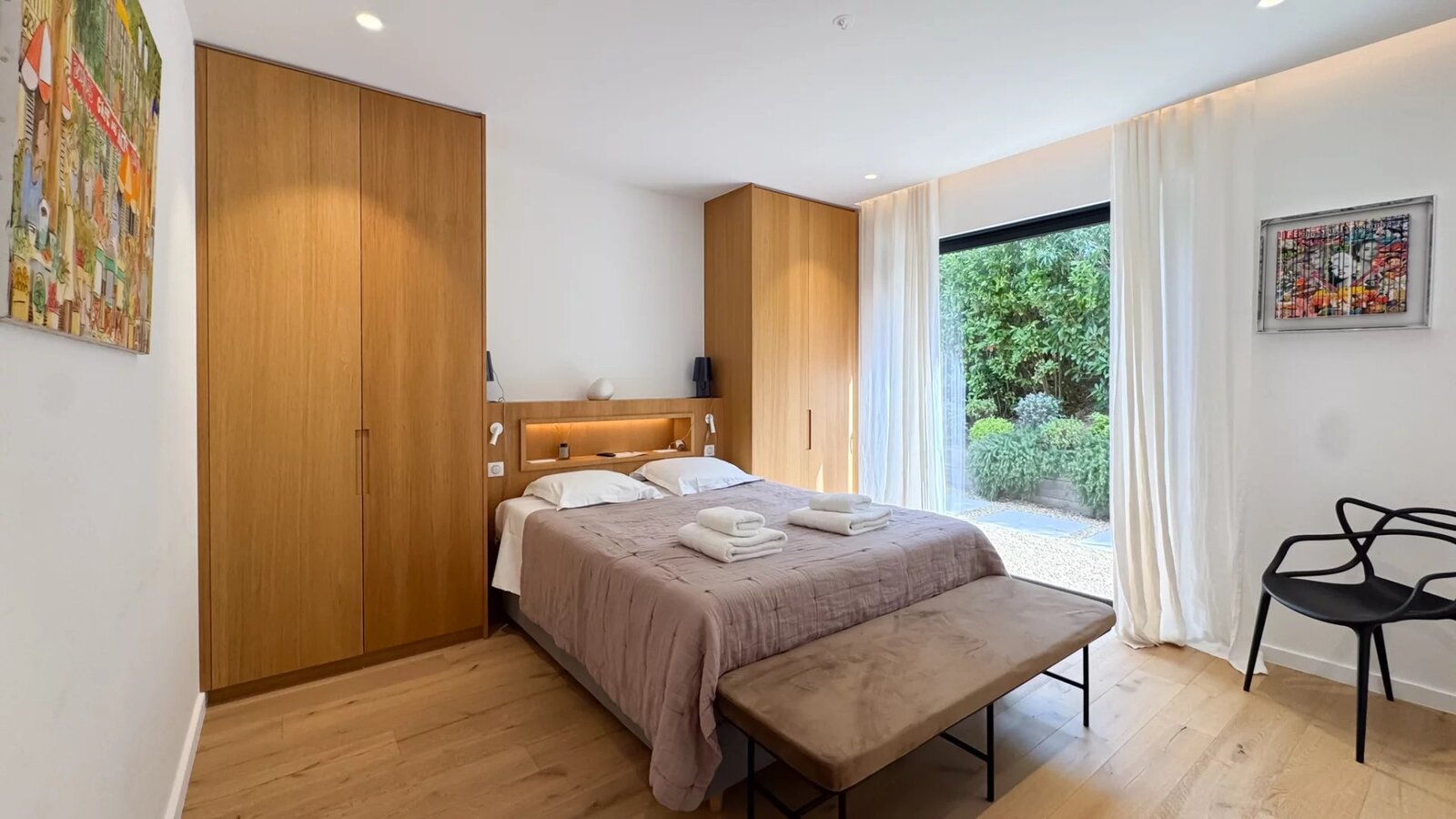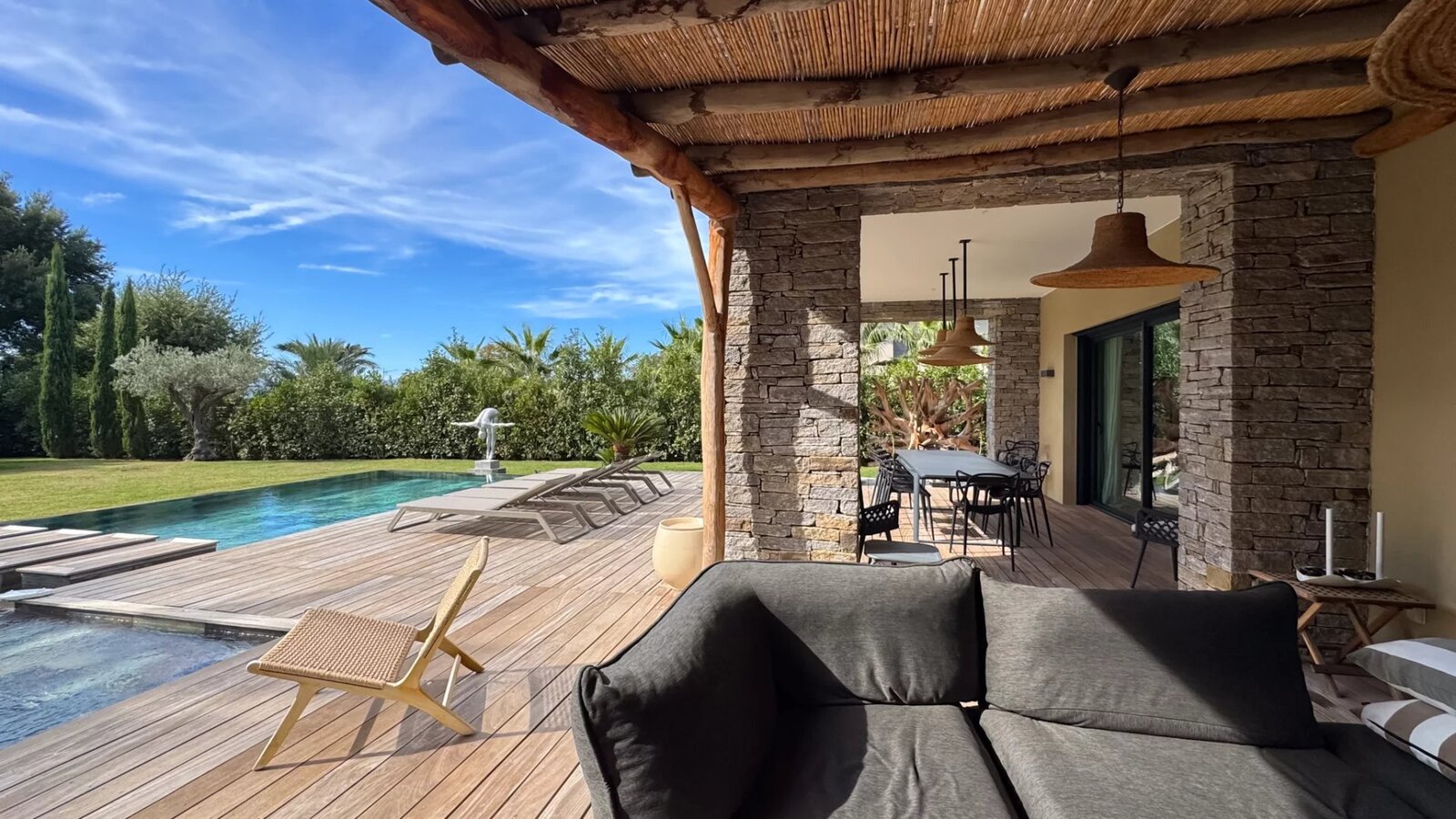 The villa offers five comfortable suites, each with its own bathroom and custom storage. The master suite, located on the upper level, benefits from a private terrace overlooking the garden, providing an intimate and privileged space.