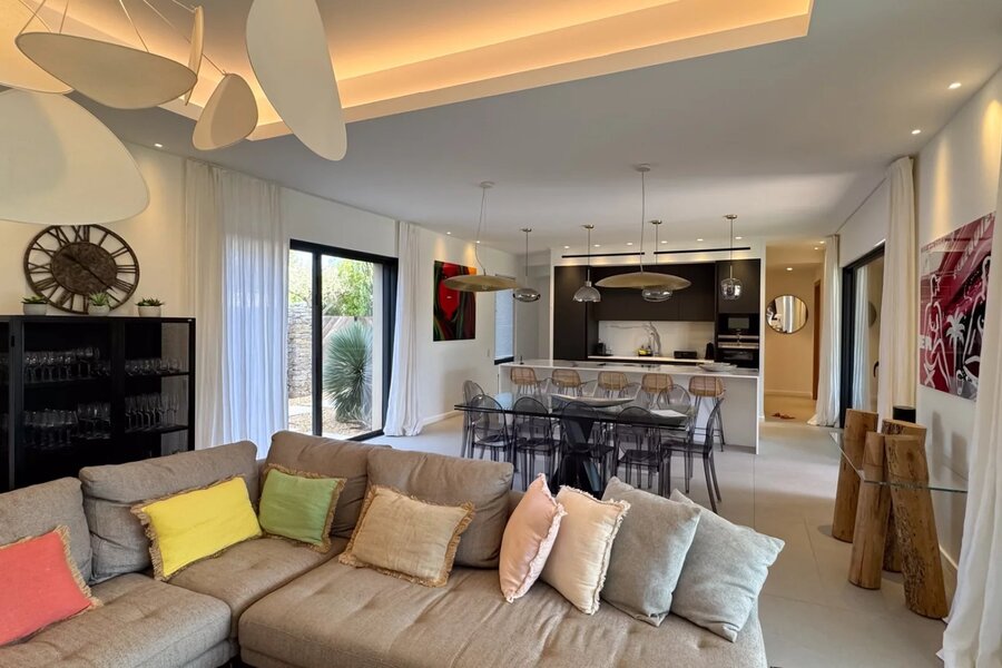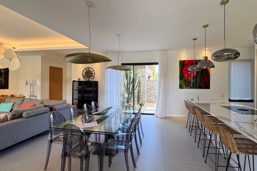 The interior architecture emphasizes generous volumes and abundant natural light. The living areas, comprising a spacious lounge, a welcoming dining room, and a fully equipped kitchen, open seamlessly onto the terraces through large glass doors, creating a fluid connection between indoors and outdoors.