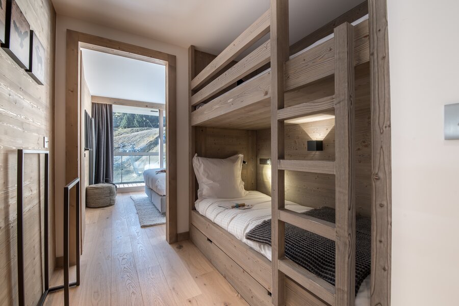 - Une suite familiale composée d'une chambre parentale et d'un espace enfants avec lits superposés, partageant une salle de bains avec toilettes, deux chambres doubles en suite, chacune avec salle de bains et toilettes et une chambre junior indépendante avec lits superposés et rangements.