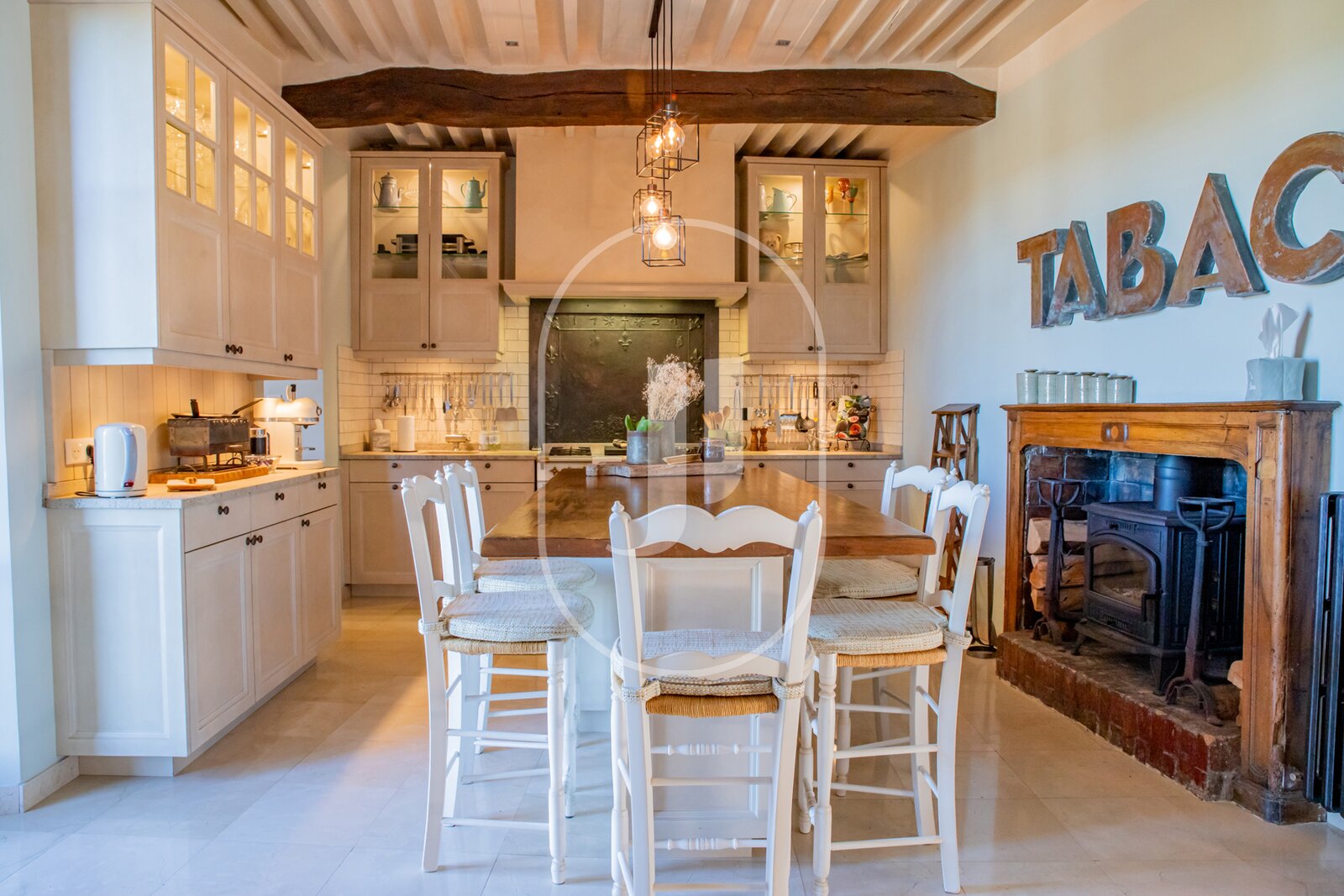 Het tuinniveau aan de zwembadzijde, iets hoger gelegen, omvat een warme woonkamer met inbouwhaard, een lichte eetkamer, een hoogwaardige leefkeuken van Atelier de Saint Paul met houtkachel en een functionele bijkeuken.