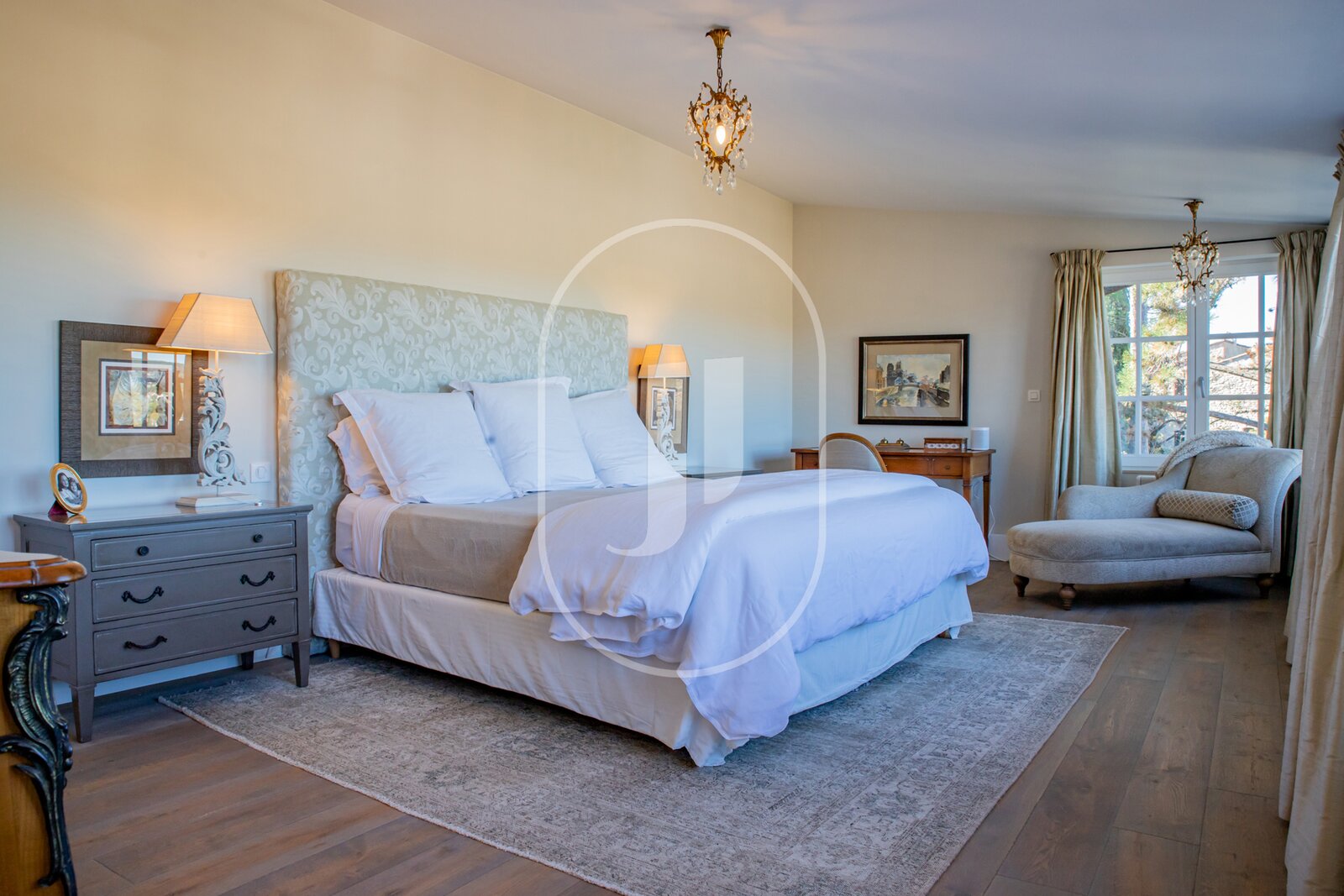 De terrassen en de aangelegde tuin omringen het huis en integreren harmonieus een groot verwarmd infinity-zwembad (12m x 6m), een buitendouche en een pétanque-terrein dat ook als privéparkeerplaats dient (voor een kleine auto), zeldzaam in de bovenstad.