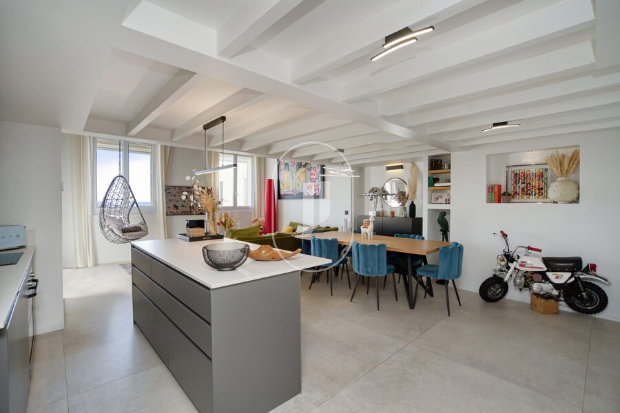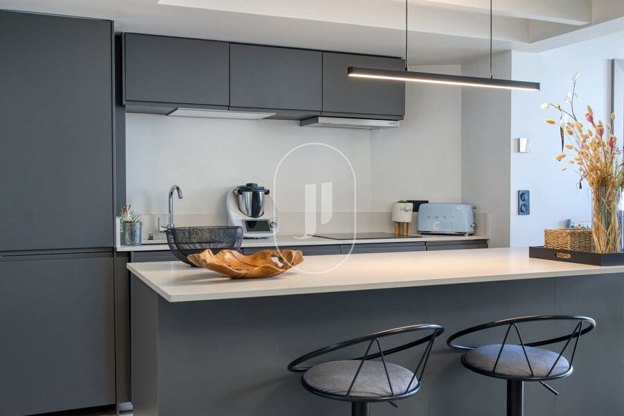 Het appartement bevindt zich op een hogere verdieping, bereikbaar met een lift, en is volledig gerenoveerd in een eigentijdse stijl die direct in het oog springt. De hoge plafonds zorgen voor een gevoel van ruimte en licht, terwijl de open keuken naadloos aansluit op de eetkamer. Onder de stijlvol ontworpen trap bevindt zich een knusse bibliotheekhoek, ideaal voor een rustig moment met een goed boek. Op de benedenverdieping vindt u bovendien ook een gastentoilet en een praktische bijkeuken.
