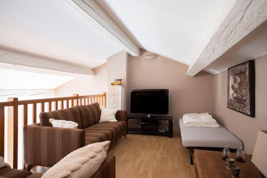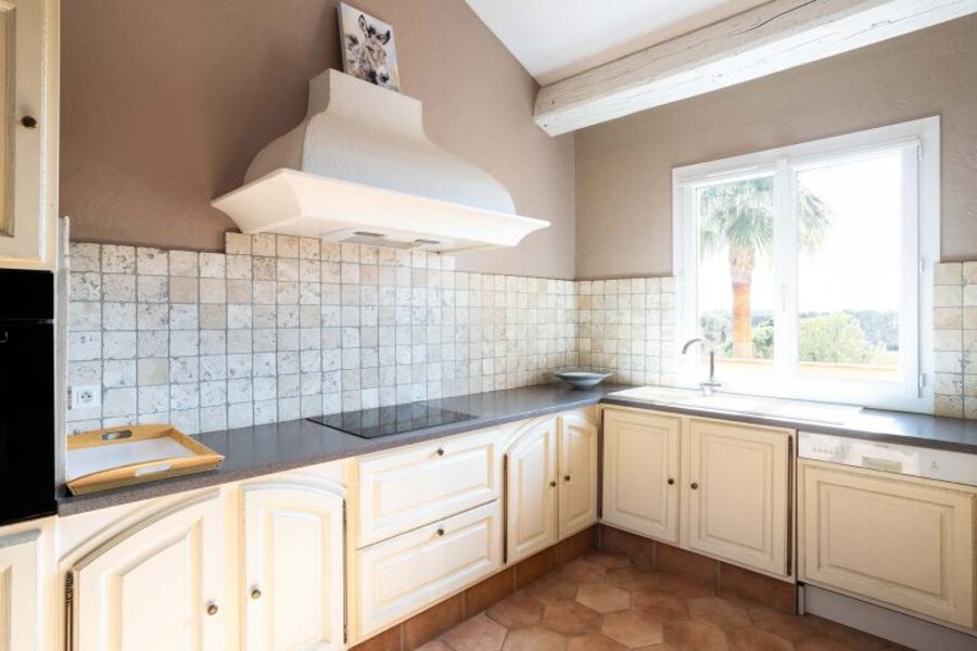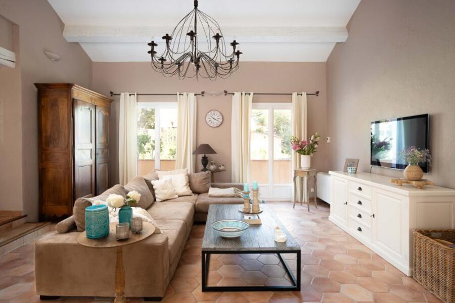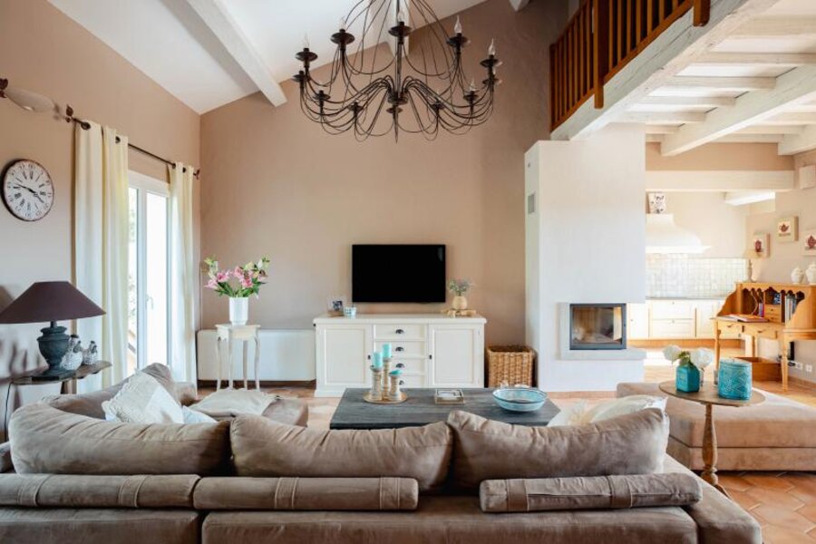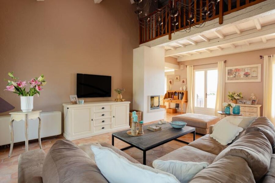 Met haar 330 m² woonoppervlak is de villa royaal te noemen en geschikt voor max. 12 personen. De living is gezellig ingericht met comfortabele meubels in een landelijke stijl. Openslaande deuren geven toegang tot het deels overdekte terras op de eerste verdieping. Zo geniet je optimaal van het weidse uitzicht over de wijnvelden en de Provençaalse heuvels. Een trap in de living leidt naar een vide waar een extra televisiehoek is gemaakt. De villa biedt meerdere tv-toestellen. TV-Vlaanderen zenders zijn beschikbaar.
