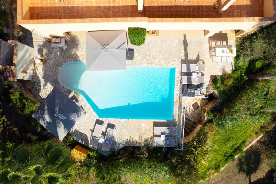 Het zembad meet 6 x 3 meter en is diep van 50 tot 180 cm. Er zijn voldoende comfy ligbedden en parasols aanwezig, net als een buitendouche.