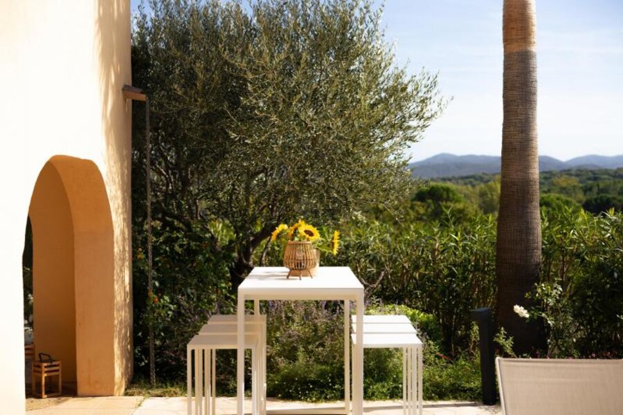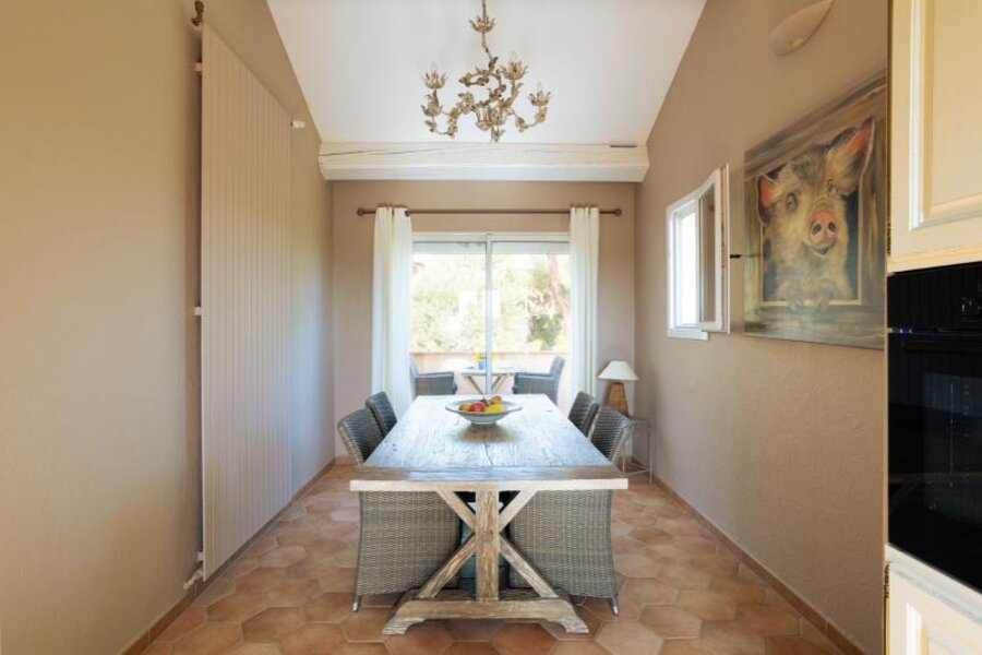 Op het gelijkvloers is een 2de living bij het openluchtzwembad. Hier staat een loungeset en een eettafel. Ook hier kan je tv kijken met het geweldige Provençaals landschap als decor.
