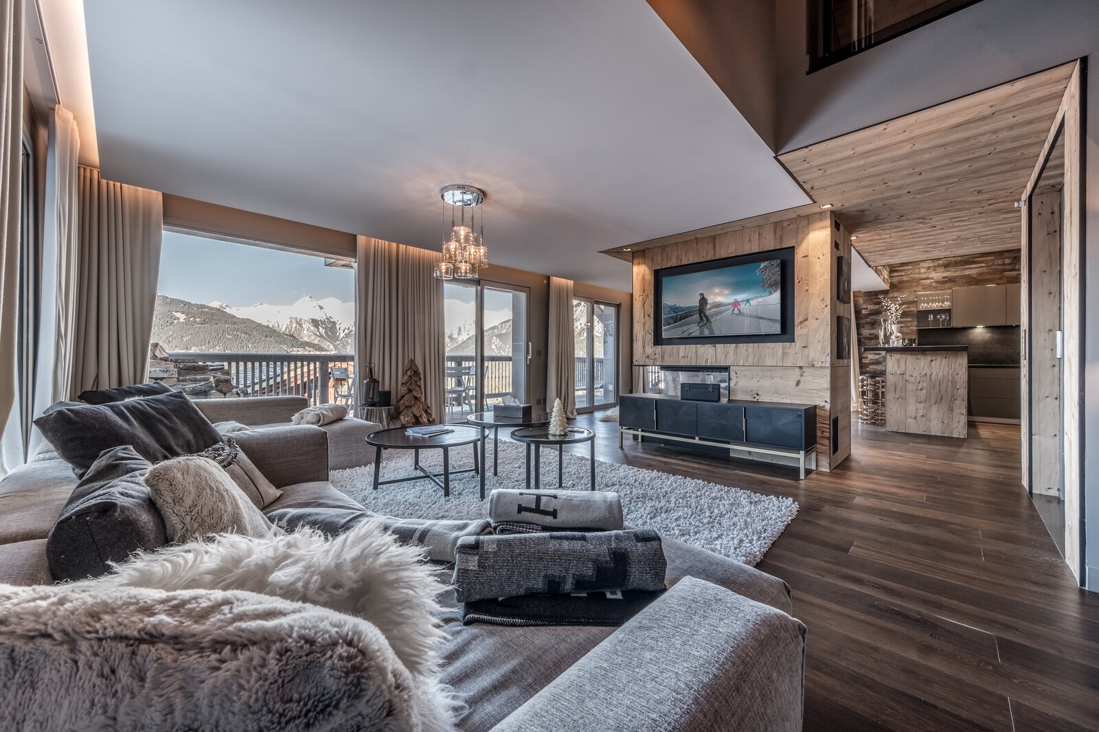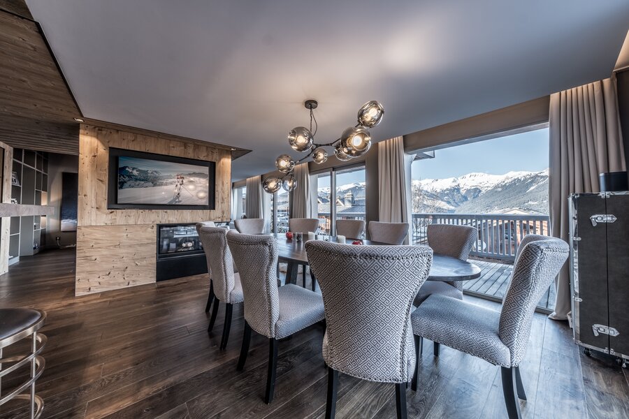 Développant une surface d'environ 285 m², il s'organise autour d'un niveau complet dédié à la réception. Celui-ci accueille une vaste pièce de vie structurée par une cheminée centrale, une salle à manger avec cuisine ouverte et bar, ainsi qu'un espace salon agrémenté d'une bibliothèque. L'ensemble est largement ouvert par de grandes baies vitrées donnant accès à une terrasse offrant des vues panoramiques sur les montagnes.