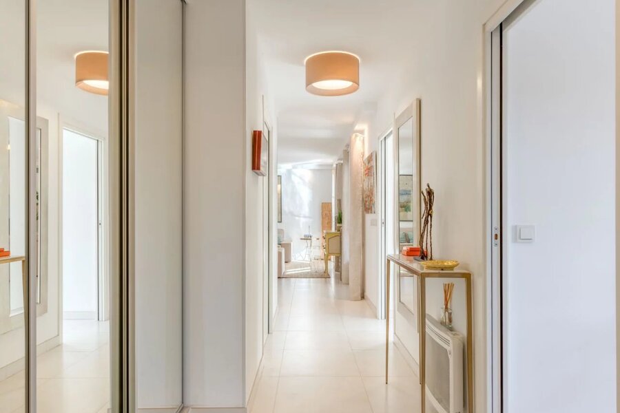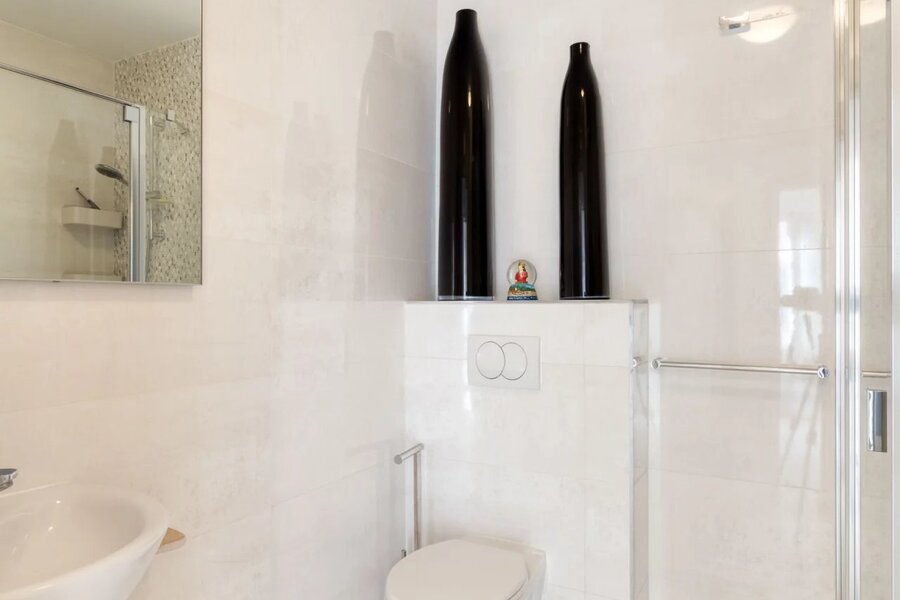 Cet appartement comprend trois chambres, dont deux spacieuses chambres principales et une troisième chambre pouvant servir de chambre d'enfant ou de bureau. Il dispose également de nombreux rangements intégrés, d'une salle de bains spacieuse et d’une salle de douche séparée.