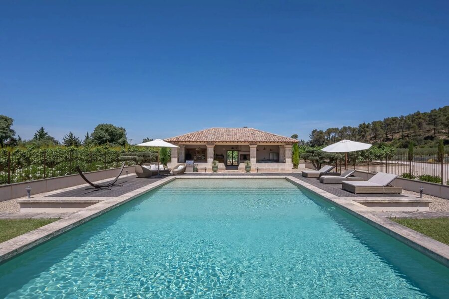 A l’extérieur, vous pourrez profiter du grand pool-house (100m2) totalement équipé (piano, four à pizza etc …) avec sa piscine de 15x7,5. Le tout entouré d’un jardin à la Française, de pieds d’oliviers (350 pieds) et de figuiers.
