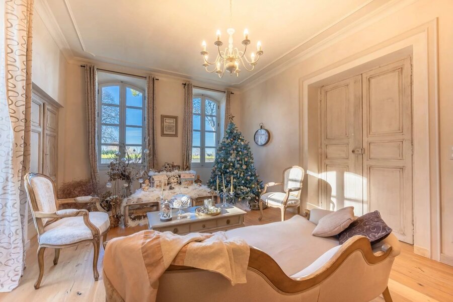 Elle propose 500 m2 habitables. Vous trouverez un magnifique perron d’époque qui permet d’accéder à la porte principale du château.